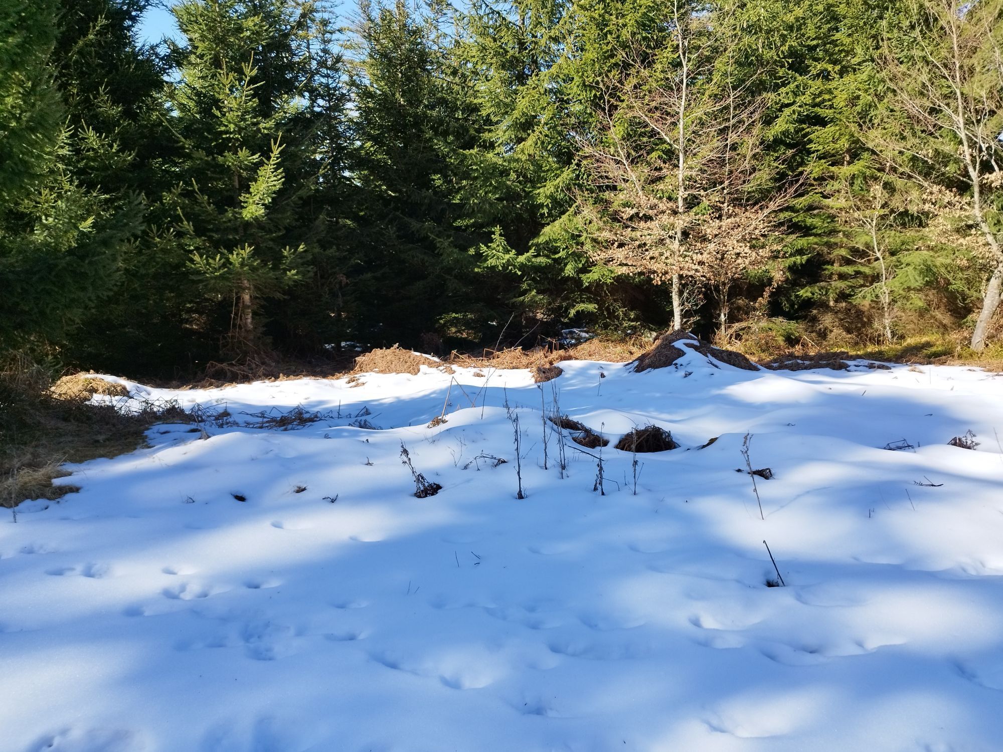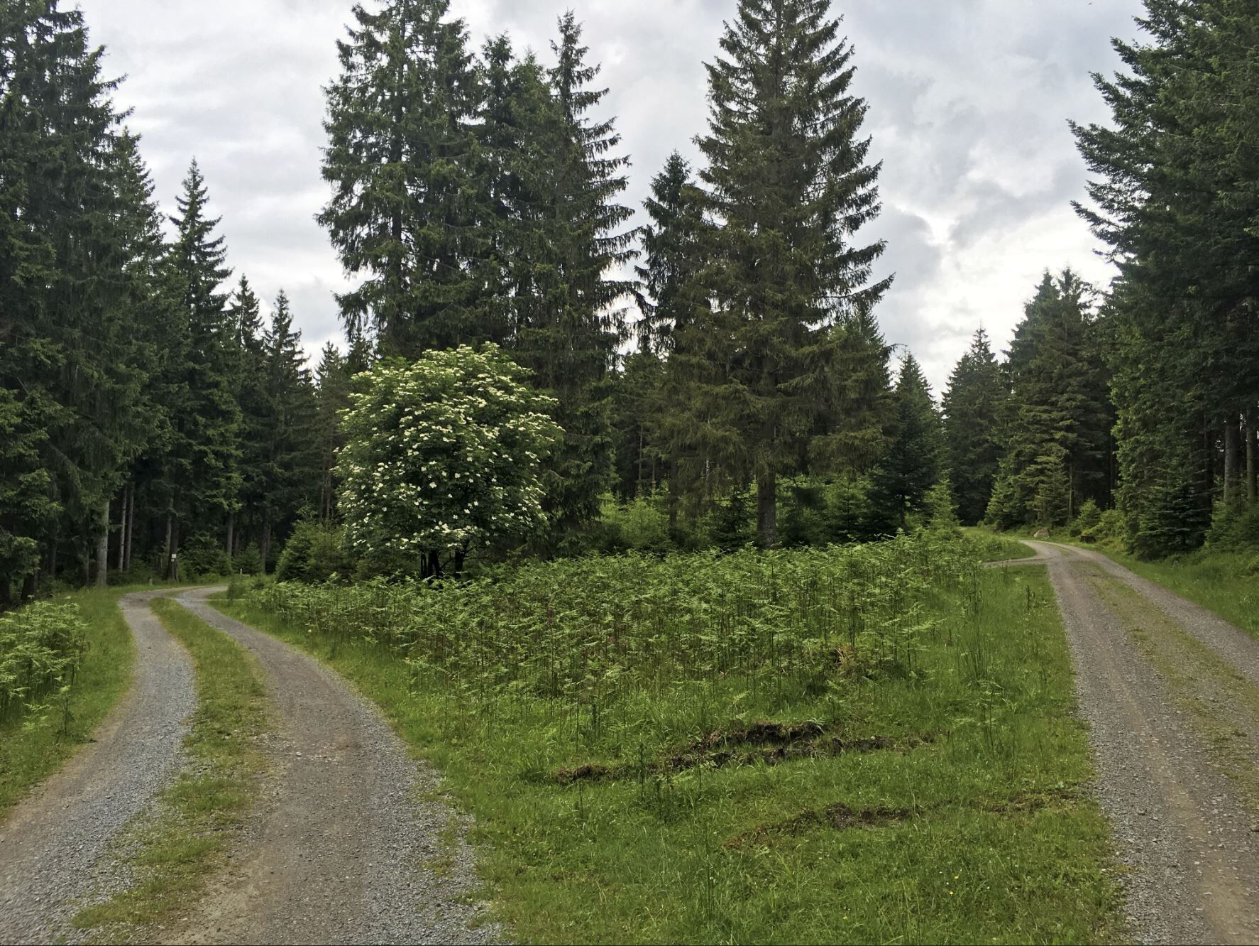 Es geht weiter geradeaus und unterhalb vom Hohlohturm vorbei weiter bis zur L76b (km 34,3). Wir überqueren die L76b und fahren weiter auf dem Mittelweg in Richtung Kreuzlehütte / Teufelsgrab. Bei km 35,5 geradeaus auf dem Gradweg weiter zur Kreuzlehütte. Am Ende des Weges rechts abbiegen und an der Gabelung gleich links halten. Links halten bei km 37,3. Nach 500m rechts halten.