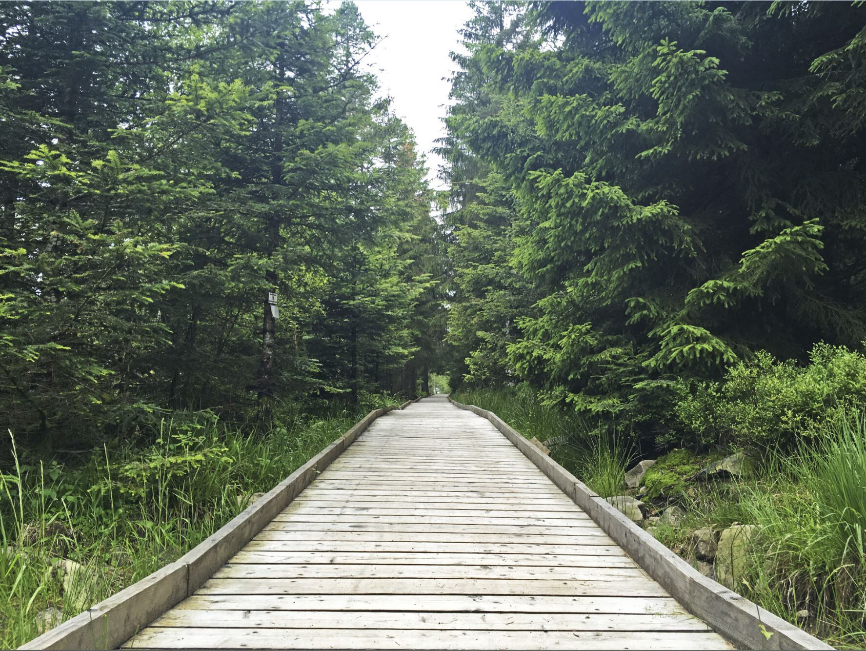 Nach einer kurzen Abfahrt in die Ortsmitte von Enzklösterle folgt ein weiterer langer Anstieg hinauf zum Moor- und Naturschutzgebiet am Hohlohsee. Ein Bohlenweg führt durch das Moor (Schiebestrecke!) und der Weg führt im weiteren Verlauf direkt auf den Hohlohturm mit beeindruckender Aussicht zu.