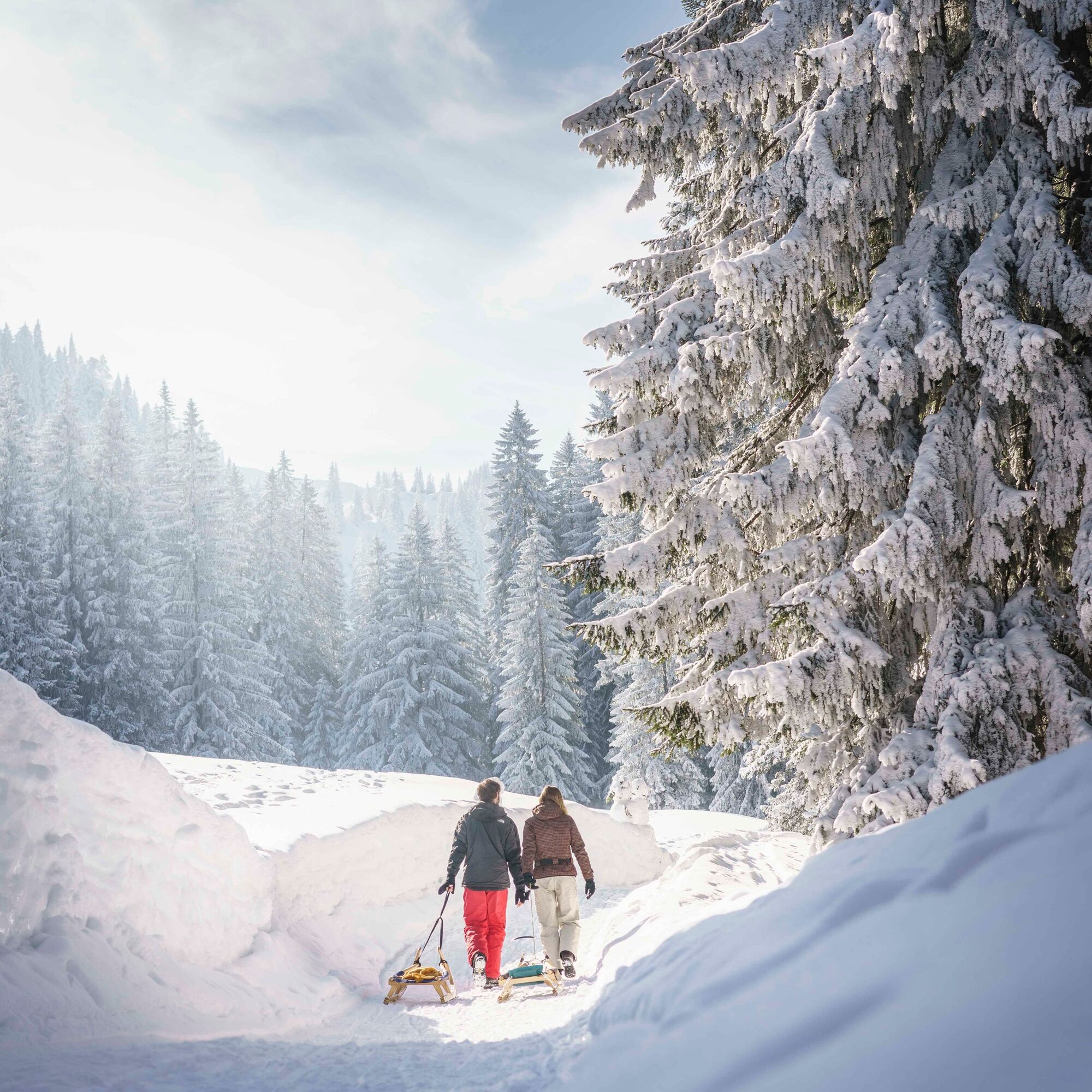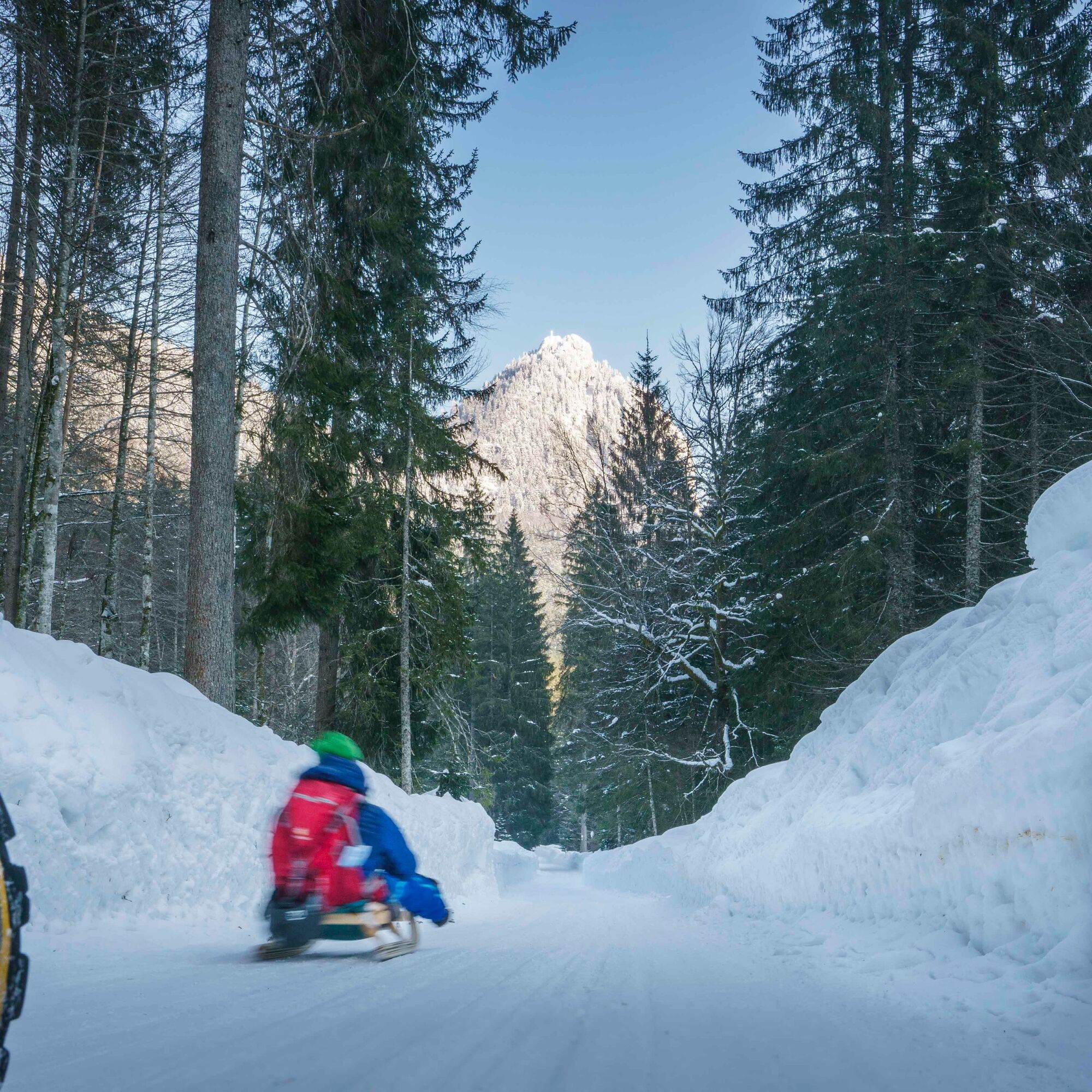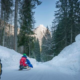 Vom Parkplatz am Kurvenlift folgen wir der Fahrstraße hinauf zur Unteren Firstalm. Die Abfahrt erfolgt über die gleiche Strecke, so dass beim Zustieg Vorsicht vor entgegenkommenden Rodlern geboten ist! Zu Beginn rodelt man noch über offenes Almgelände, bis die Strecke dann durch den verschneiten Wald führt und beim Kurvenlift endet.