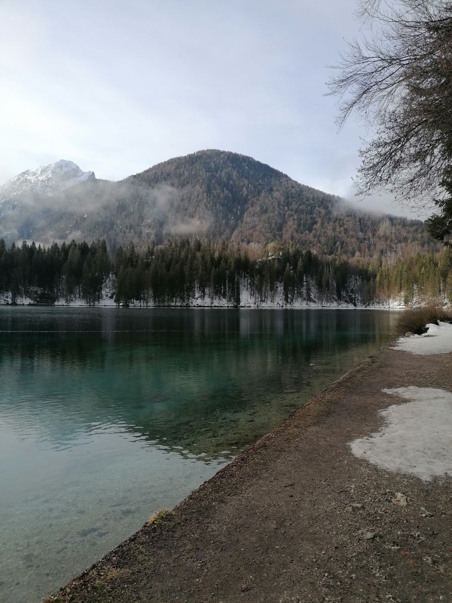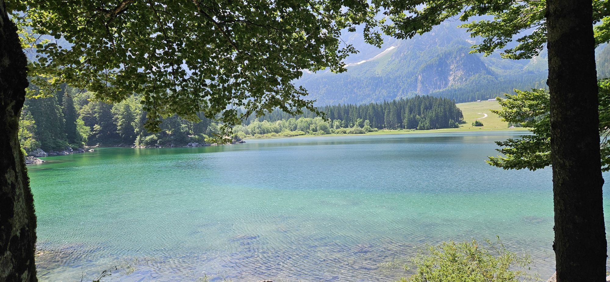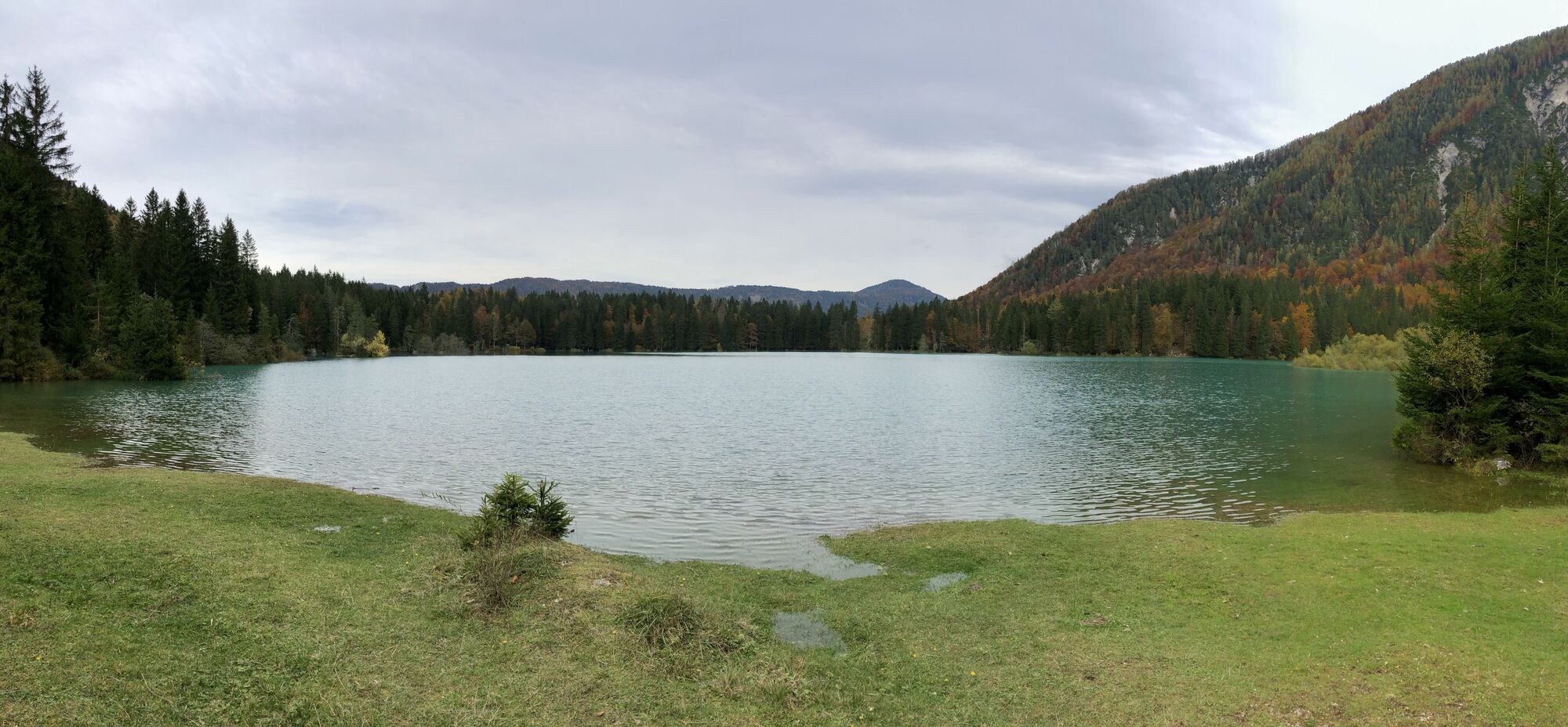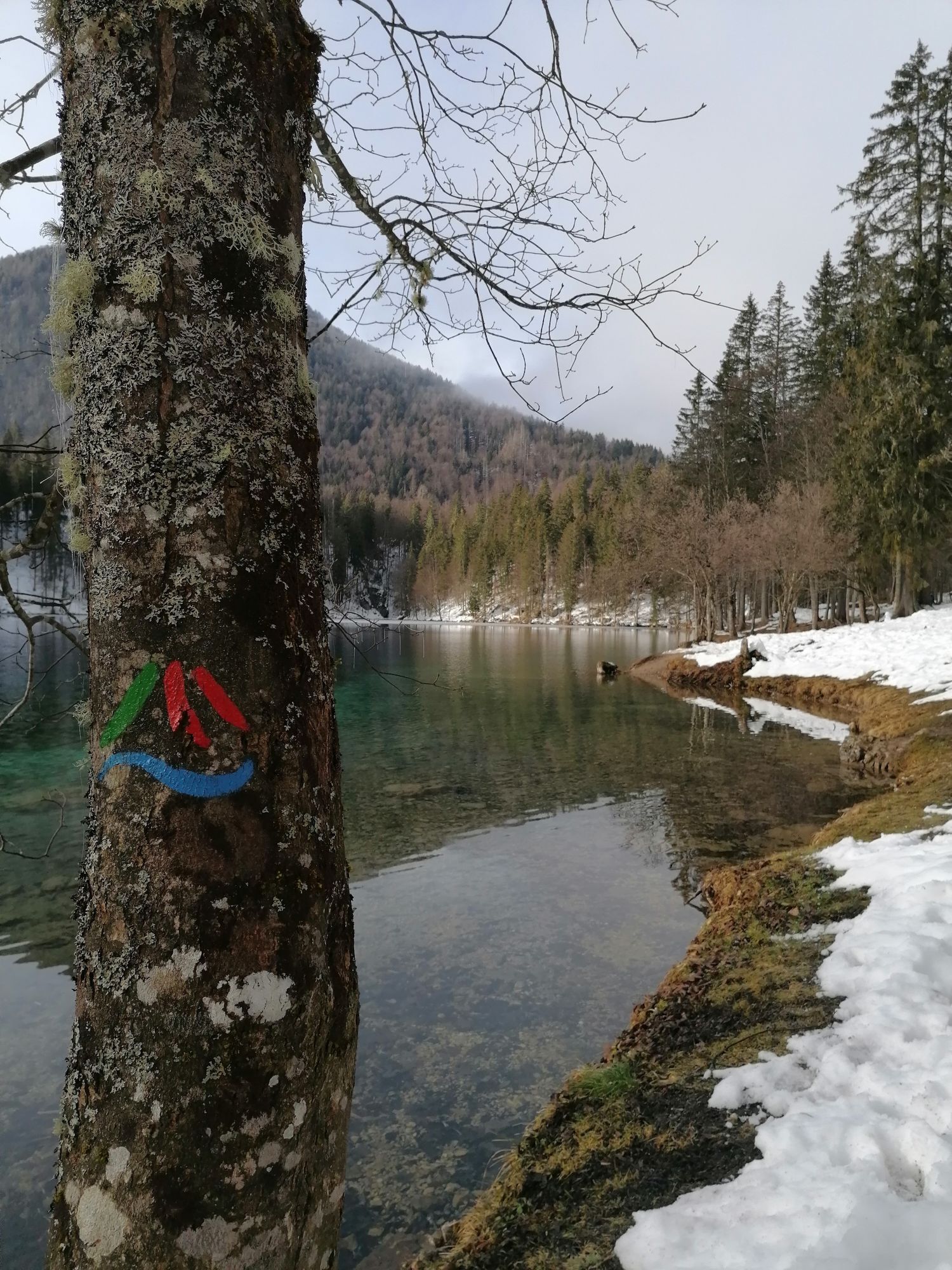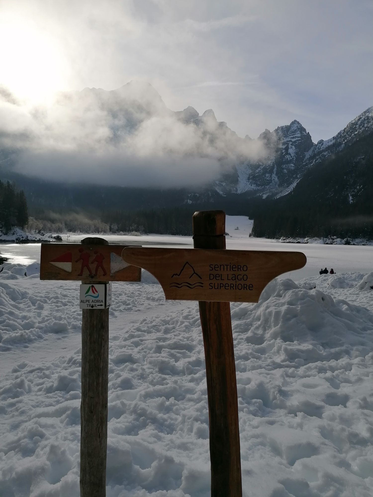 Egy rövid erdei szakasz után, amelyet néhány gyalogos híd könnyít meg, a hurok egy olyan lejtÅszakaszon halad át, amelyet a Rio del Lago patakba ömlÅ víz jellemez. Jobbra haladva feltűnnek a Mangart és a Ponze falak. A partot követve a bükk- és lucfenyÅerdÅn keresztül elhaladunk azon a területen, ahol a tó a legszélesebb. Az ösvény emelkedik, hogy átkeljen egy morénakordonon, amelyet néhány hatalmas sziklatömb jellemez. A gyenge domborzatról ismét leereszkedünk, és az erdÅben folytatjuk utunkat, hogy elérjük a Lago Superiore-t. A nyugati partot a tó folyását követÅ ösvényen kerüljük meg, amíg elérjük a kiterjedt déli síkságot. Az ösvény a Lago Superiore partja mentén folytatódik. Eléri az Edelweiss Hut felé vezetÅ széles sétányt, ahonnan kiindulópontja az odaútnak (tó ösvény), vagy közvetlenül az aszfaltúton.