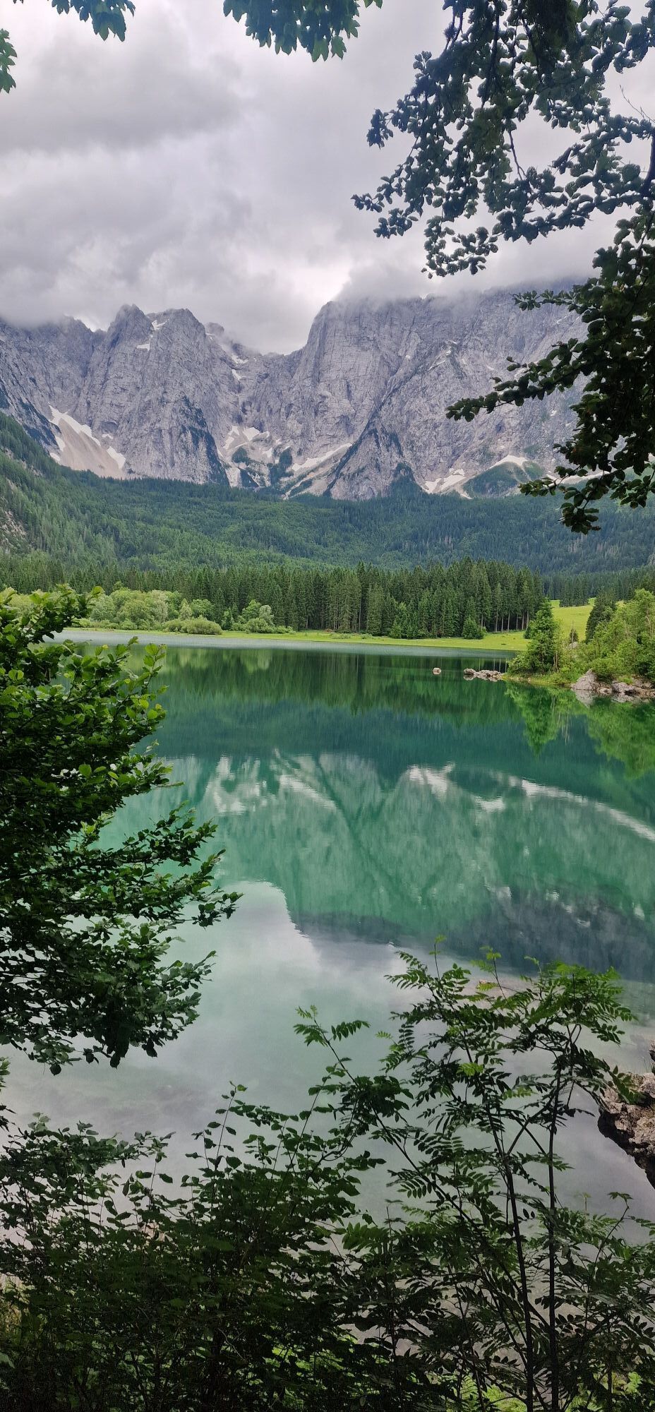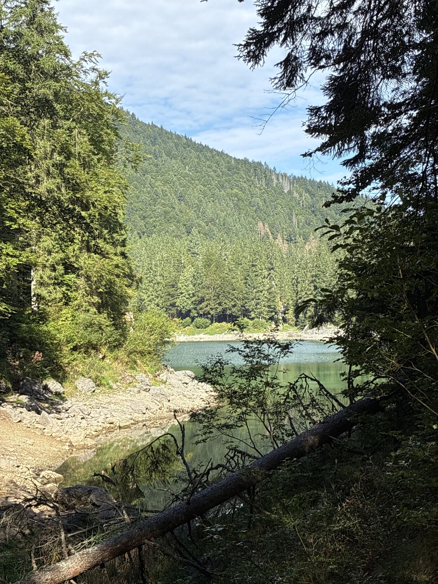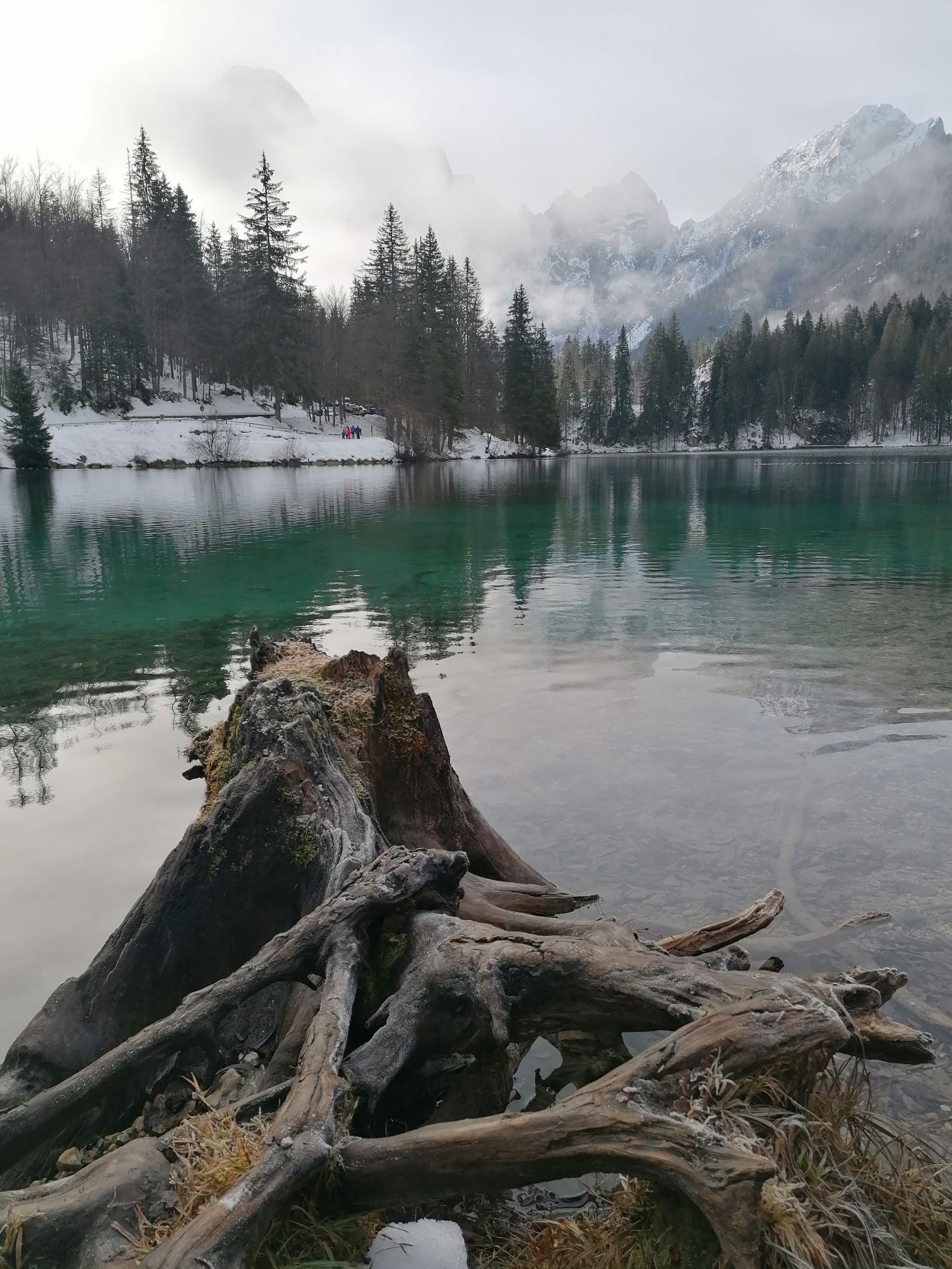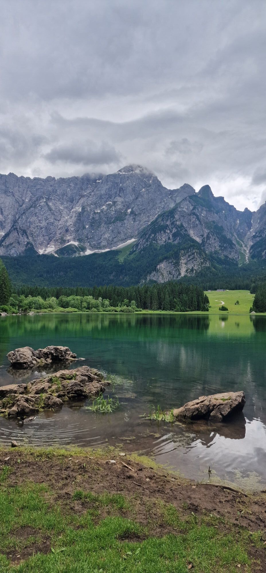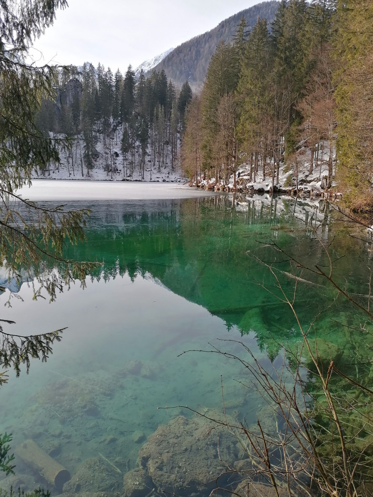 Egy rövid erdei szakasz után, amelyet néhány gyalogos híd könnyít meg, a hurok egy olyan lejtÅszakaszon halad át, amelyet a Rio del Lago patakba ömlÅ víz jellemez. Jobbra haladva feltűnnek a Mangart és a Ponze falak. A partot követve a bükk- és lucfenyÅerdÅn keresztül elhaladunk azon a területen, ahol a tó a legszélesebb. Az ösvény emelkedik, hogy átkeljen egy morénakordonon, amelyet néhány hatalmas sziklatömb jellemez. A gyenge domborzatról ismét leereszkedünk, és az erdÅben folytatjuk utunkat, hogy elérjük a Lago Superiore-t. A nyugati partot a tó folyását követÅ ösvényen kerüljük meg, amíg elérjük a kiterjedt déli síkságot. Az ösvény a Lago Superiore partja mentén folytatódik. Eléri az Edelweiss Hut felé vezetÅ széles sétányt, ahonnan kiindulópontja az odaútnak (tó ösvény), vagy közvetlenül az aszfaltúton.