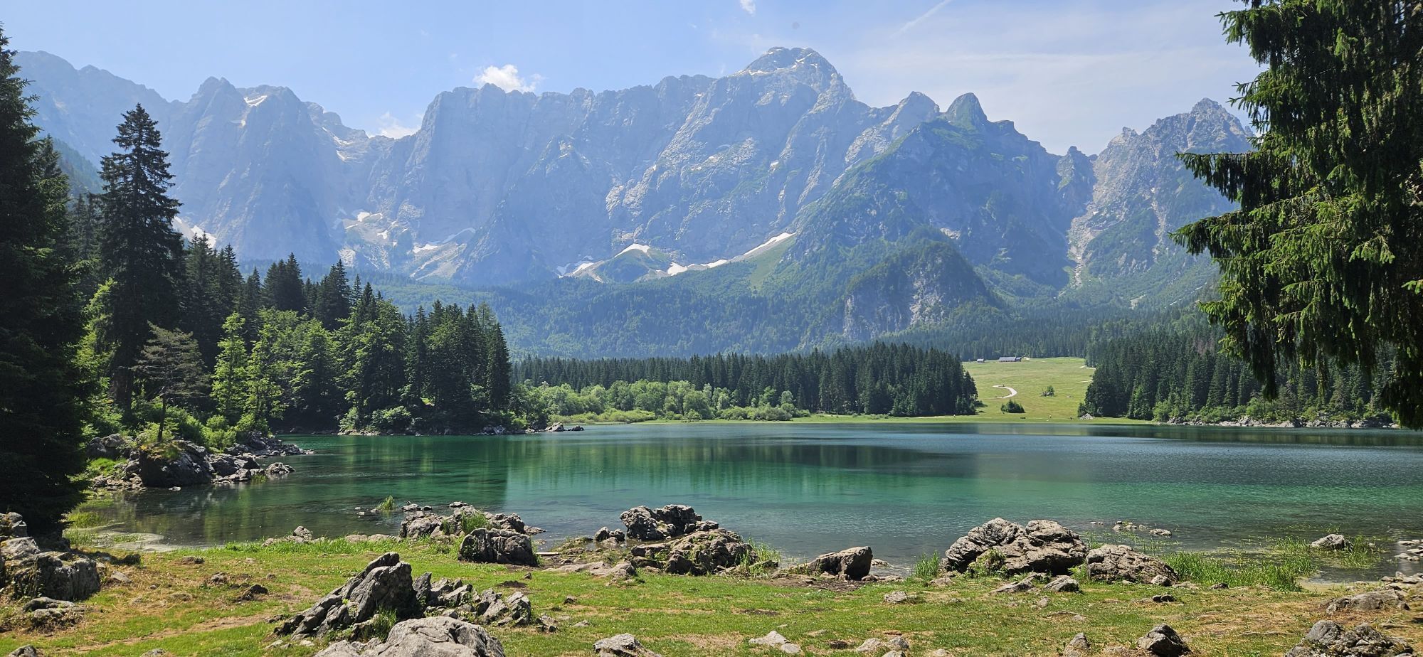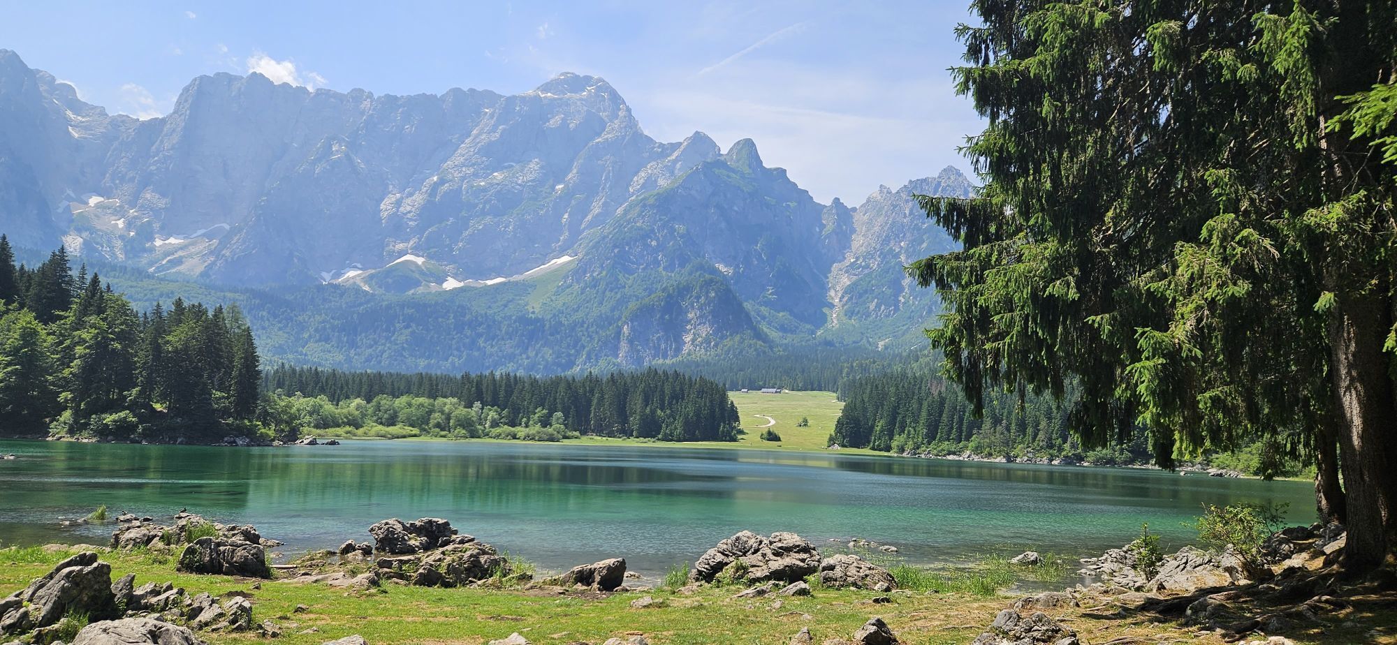 Egy rövid erdei szakasz után, amelyet néhány gyalogos híd könnyít meg, a hurok egy olyan lejtőszakaszon halad át, amelyet a Rio del Lago patakba ömlő víz jellemez. Jobbra haladva feltűnnek a Mangart és...