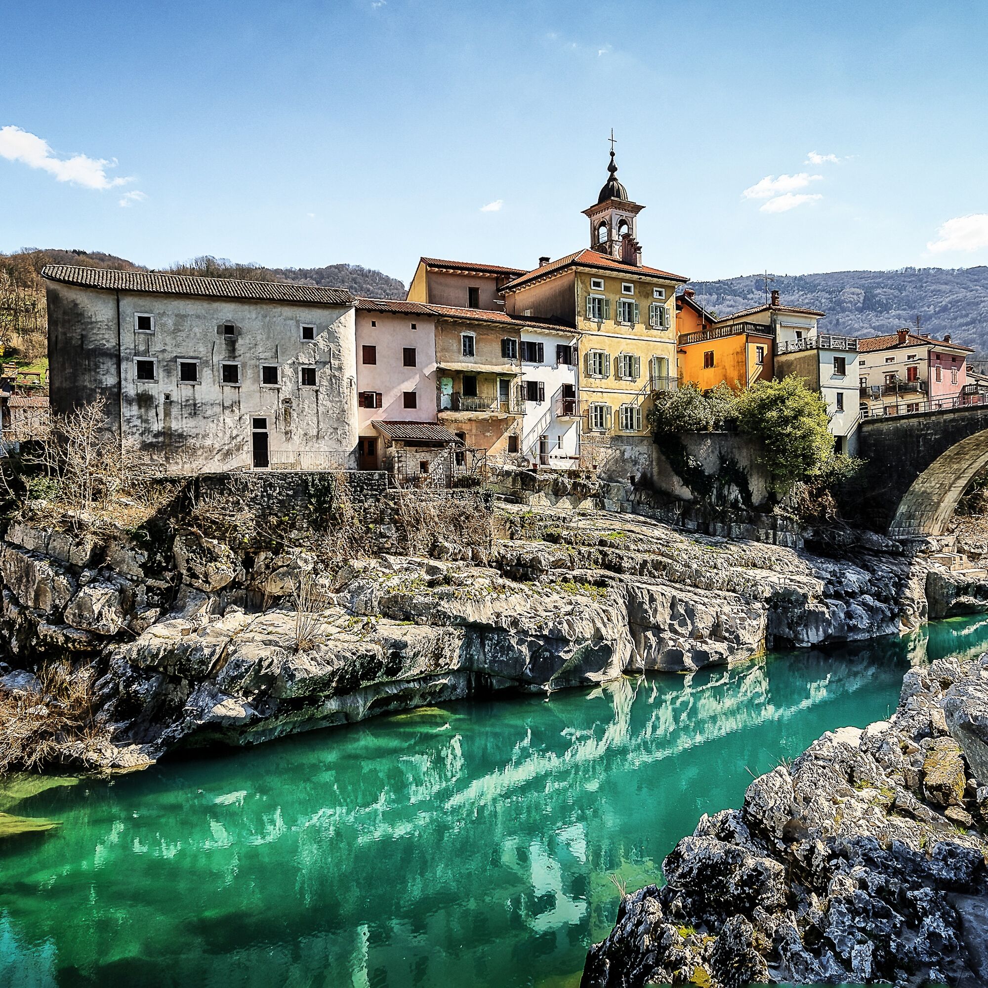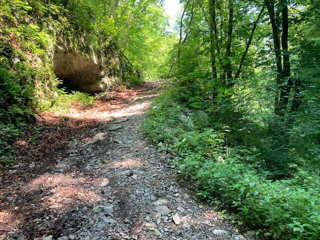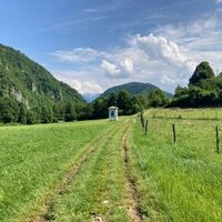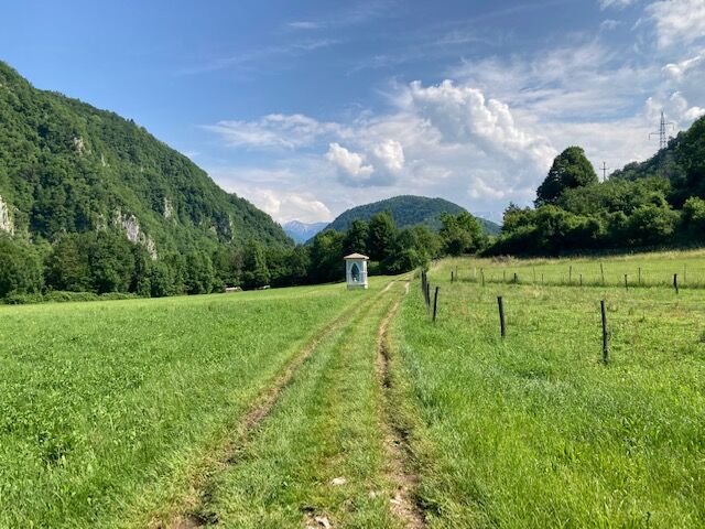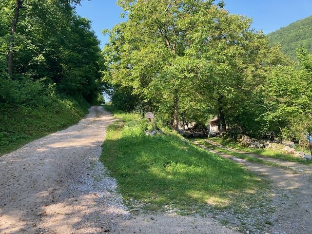 In Kanal, turn to the narrow street heading north from the square. Follow the marks for Kal nad Kanalom. Ride 5 km to Avče. At the end of Avče, turn from the main road to the right towards Doblar and descend for a kilometre along a narrow asphalt road downwards. When exiting the narrow area, pay attention to the MTB signs that point you to the narrow asphalt road to the right and upwards. Continue along it and there you shall have no problems orientating. The road takes you along the left bank of the Soča River for about 100 metres in altitude below you. The terrain comprises concrete on steep parts as well as asphalt, gravel and unpaved road. After 4 km, above Babja jama, the cart road descends to a dark ravine and on the other side rises to a more flat terrain. In this part, the cart road has stones and gravel, therefore, you need to walk by the bike for 200 metres. After a less than a kilometre, at Log village, you can drive along asphalt road to Drobočnik, turn right towards Most na Soči and you will reach the goal in a few minutes. There you can continue along the Juliana Bike route.