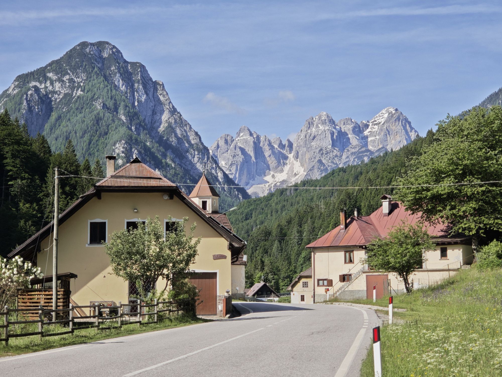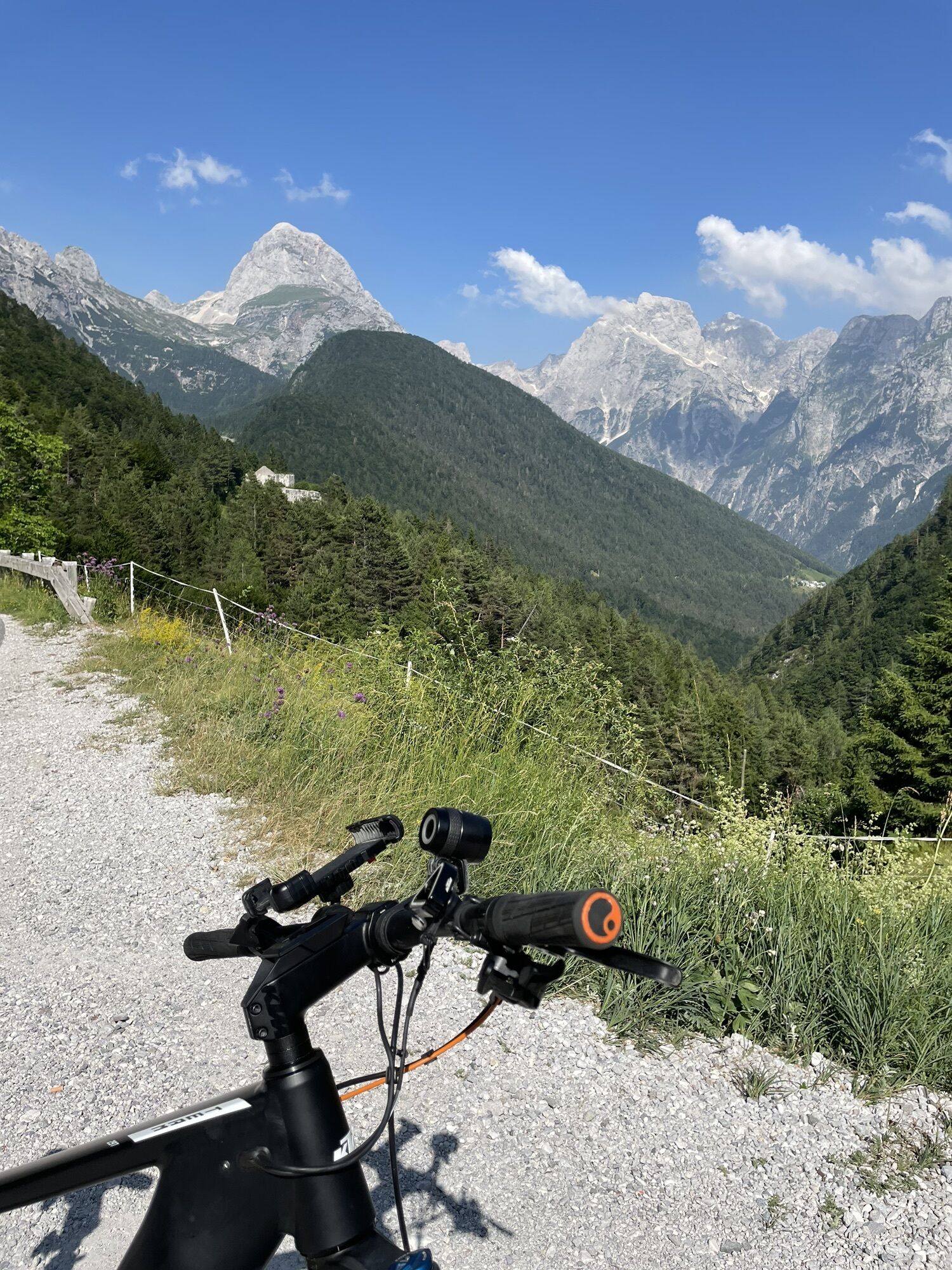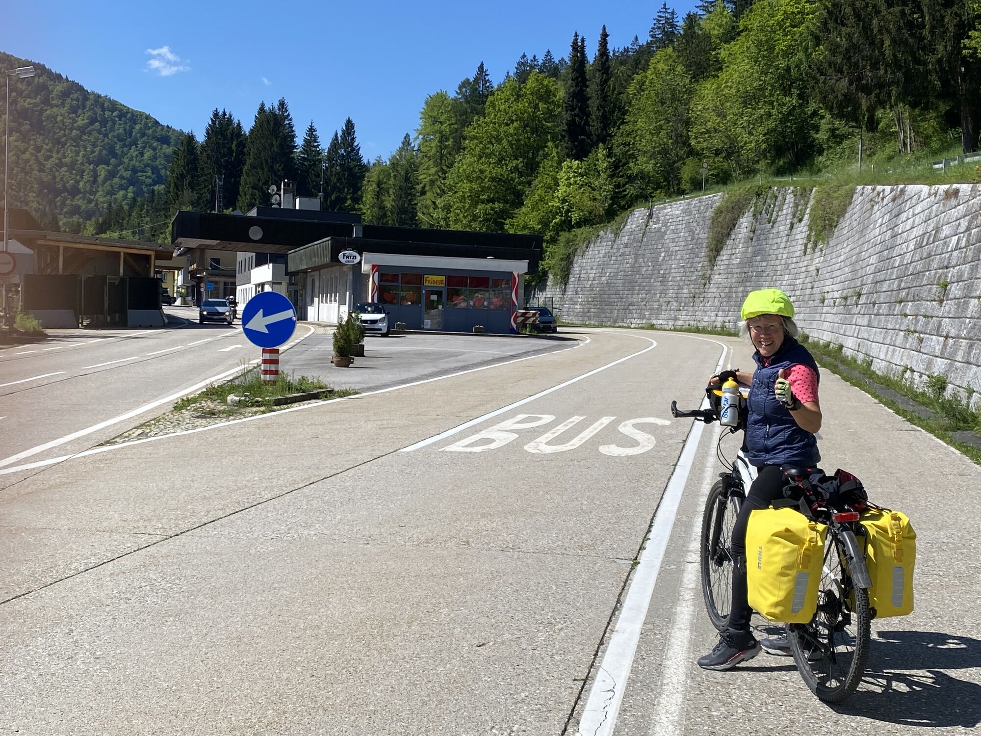 Von Feistritz an der Donau entlang der Drau bis Villach (gut beschildert), dann ebenso am Radweg Richtung Grenze nach Arnoldstein. Wir haben uns an der Grenze den Abstecher rechts weg vom Radweg (beschildert) auf eine Anhöhe erst geschenkt und sind ein kurzes Stück auf der Hauptstraße gefahren ca. 0,5km. Danach sind wir auf den Via Alpe Adria abgezweigt und diesen bis Tarvis gefahren. In Tarvis geht es dann bis zum Pass Predil auf der Hauptstraße (am besten zeitig in der Früh oder Mittag fahren). Auf der Passhöhe ist die Grenze nach Slowenien. Danach geht es lange bergab bis nach Bovec. Ca. 10 km danach kommt der kleine Ort Boka vor Zaga. Wir haben dort übernachtet.