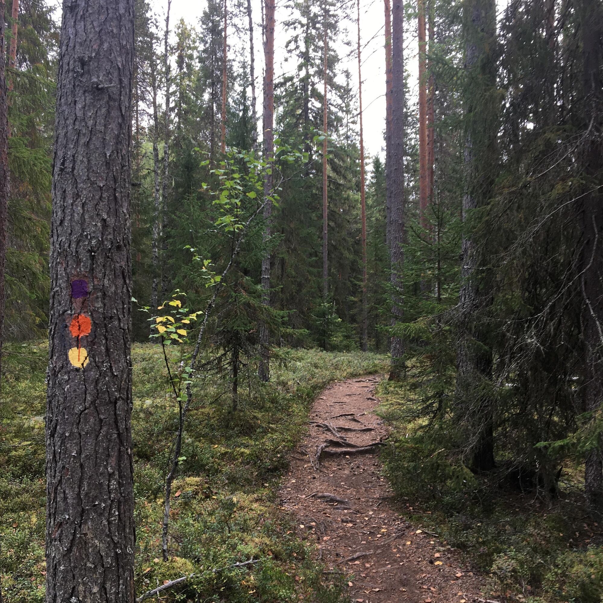 The Hiidenkierros is marked on trees and guide signs with violet paint markings.