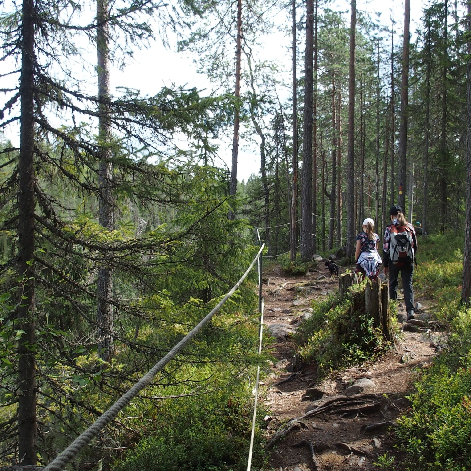 The entire Hiidenkierros is 5 km long, but if you skip the visit to the Porttilampi lean-to, the route is shortened to 3 km. The route is also suitable for children, but it is not passable with strollers. The 3 km route requires about two hours, and the 5 km route with a snack break takes about four hours.