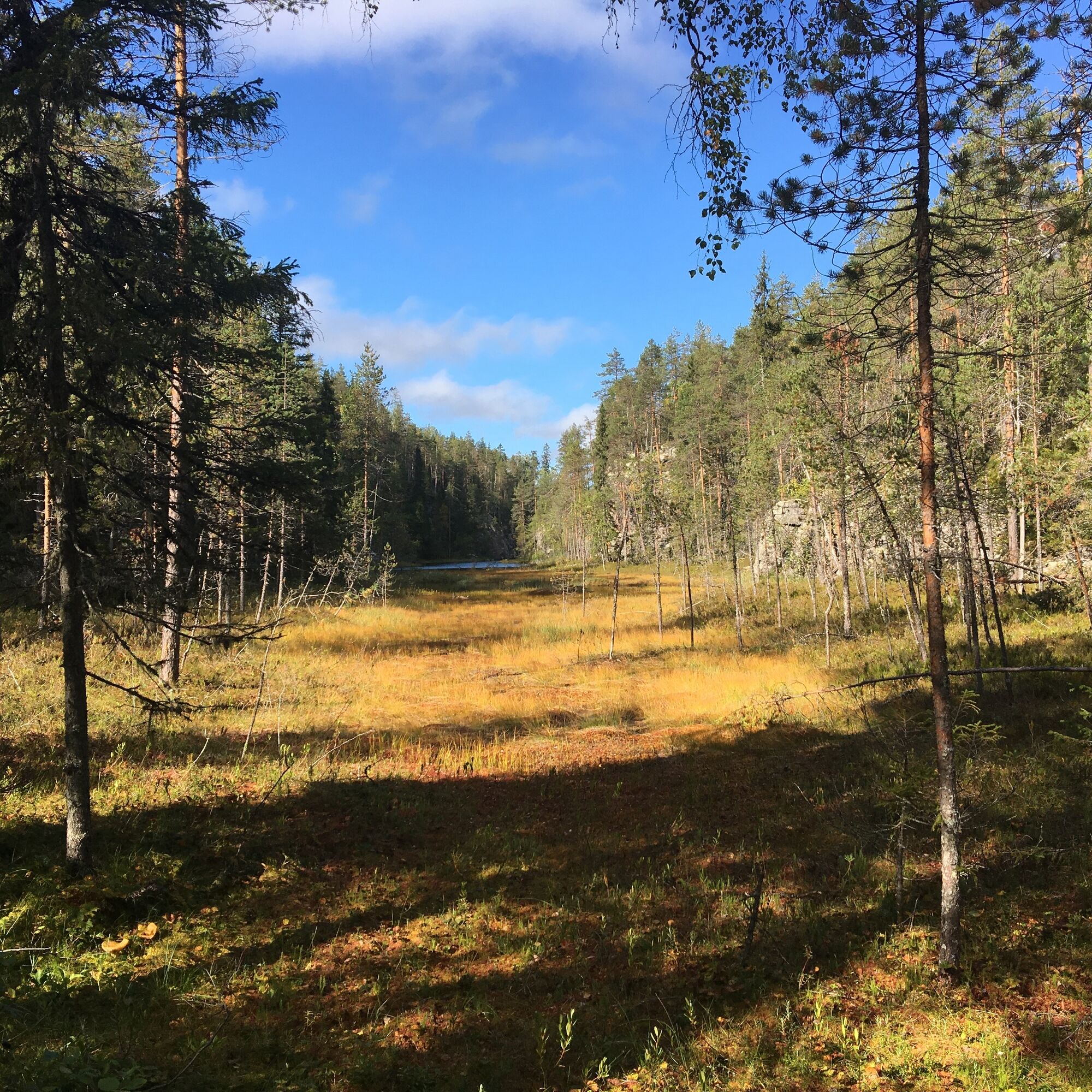 The Hiidenkierros circular route that passes through the beautiful landscapes of Hiidenportti National Park takes the hiker to explore the wilderness nature of Korpi-Kainuu at its best. The route, which passes through sometimes demanding terrain, is suitable as a day trip destination with rest stops. The route passes through the park's most famous attraction: the majestic Hiidenportti fault valley, whose rock walls fall vertically even twenty meters. In the depth of the canyon, there are black, nutrient-poor ponds. In addition, along the route vary mires and upland forests. Next to Kovasinvaara are the yard meadows of a former wilderness farm, which are among the most valuable traditional landscape sites on state land in Kainuu. Other Hiidenportti attractions also include other sites related to the area's cultural history, such as the ruins of logging and floating camps, floating dams, the twisting pin of the näre trail, the fishing tracks, hay meadows' bottoms, tar pond bottoms, and slash-and-burn birch forests.