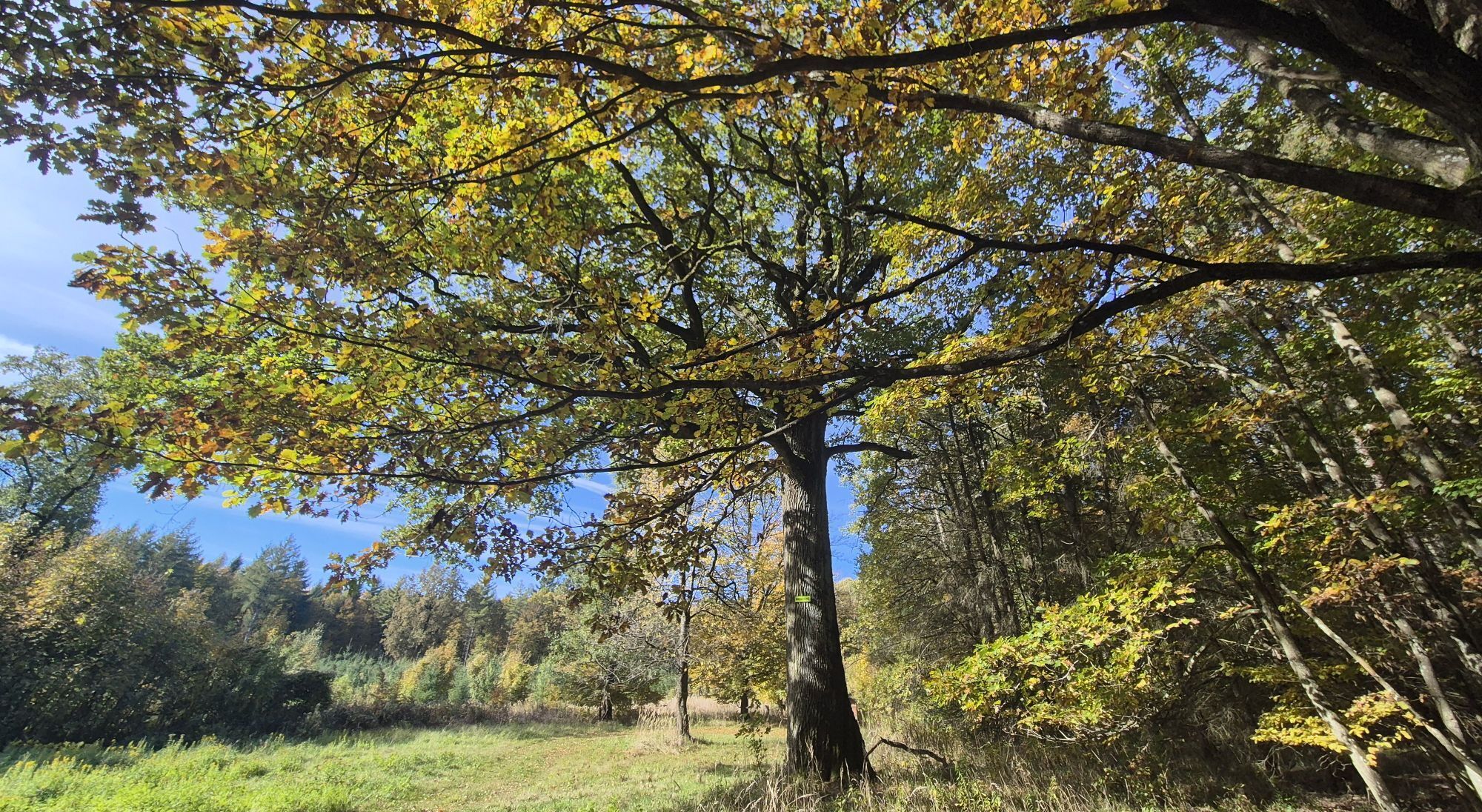 Bei zwei Wegkreuzungen am Waldrand geht man geradeaus weiter, bis der Weg wieder bergauf führt. Man folgt weiter der gelben Markierung, die bald den Fahrweg verlässt und rechts in den Wald hinein führt. An der sogenannten „Maxieiche“ geht man der Markierung folgend vorbei, bleibt bei der nachfolgenden Forstwegquerung am Weg geradeaus und bei der nächsten Forststraße erneut geradeaus, wo die Markierung anschließend auf einem unscheinbaren Pfad am Rand einer großen Lichtung entlang führt, bis eine Wegkreuzung erreicht ist, neben der ein großer Pavillon mit Schautafeln steht.