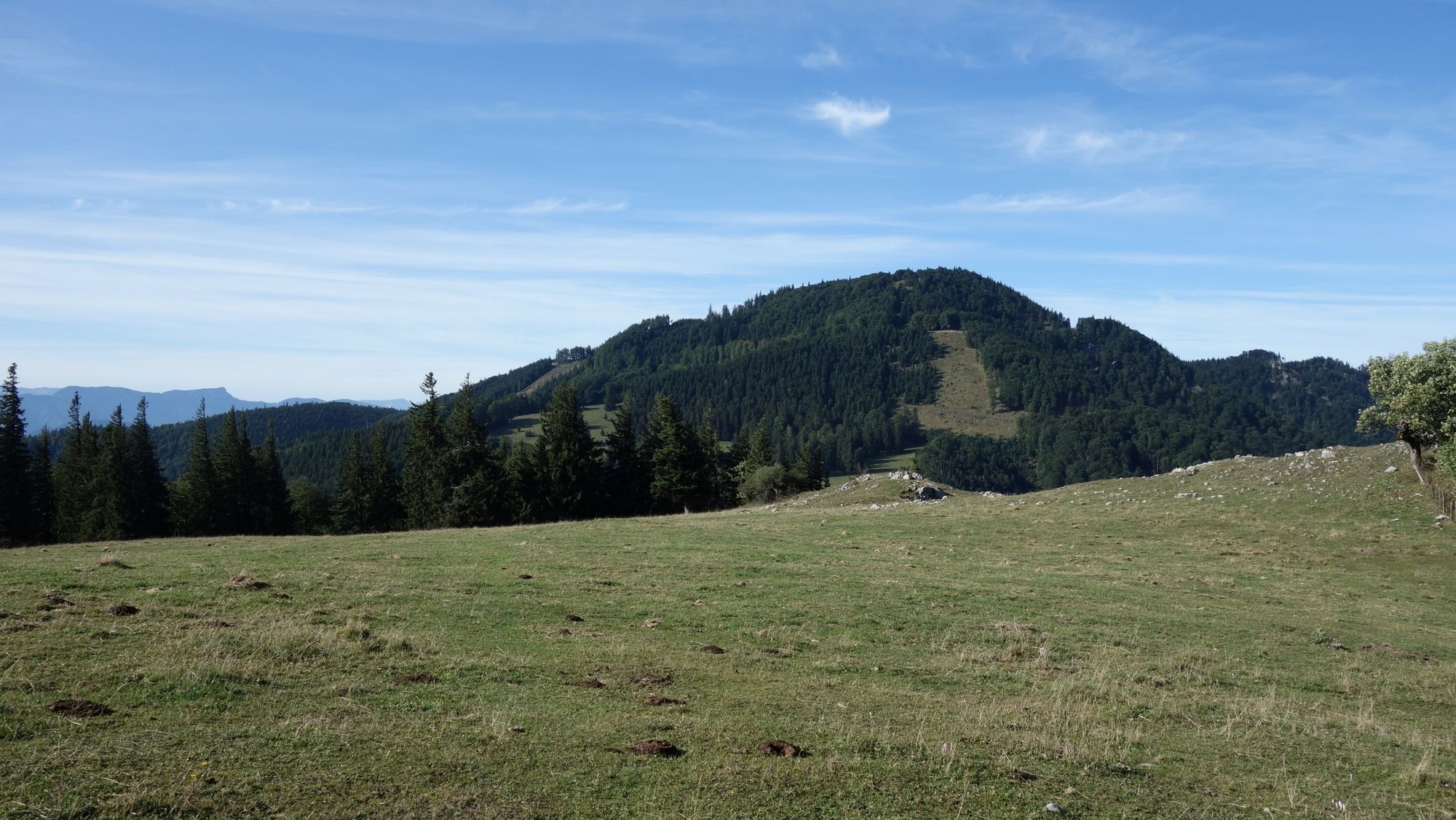 Der Wanderbeginn ist am Ebenwald-Parkplatz in Kleinzell. Ein kurzes Stück auf der Almstraße und am Gattertürl der Viehweide links rein über die Weide im langen Rechtsbogen hoch zur Waldgrenze und über den Weidezaun steigen. Am Steig im Wald bis zu einer Forststraße etwas steiler hoch und diese queren.