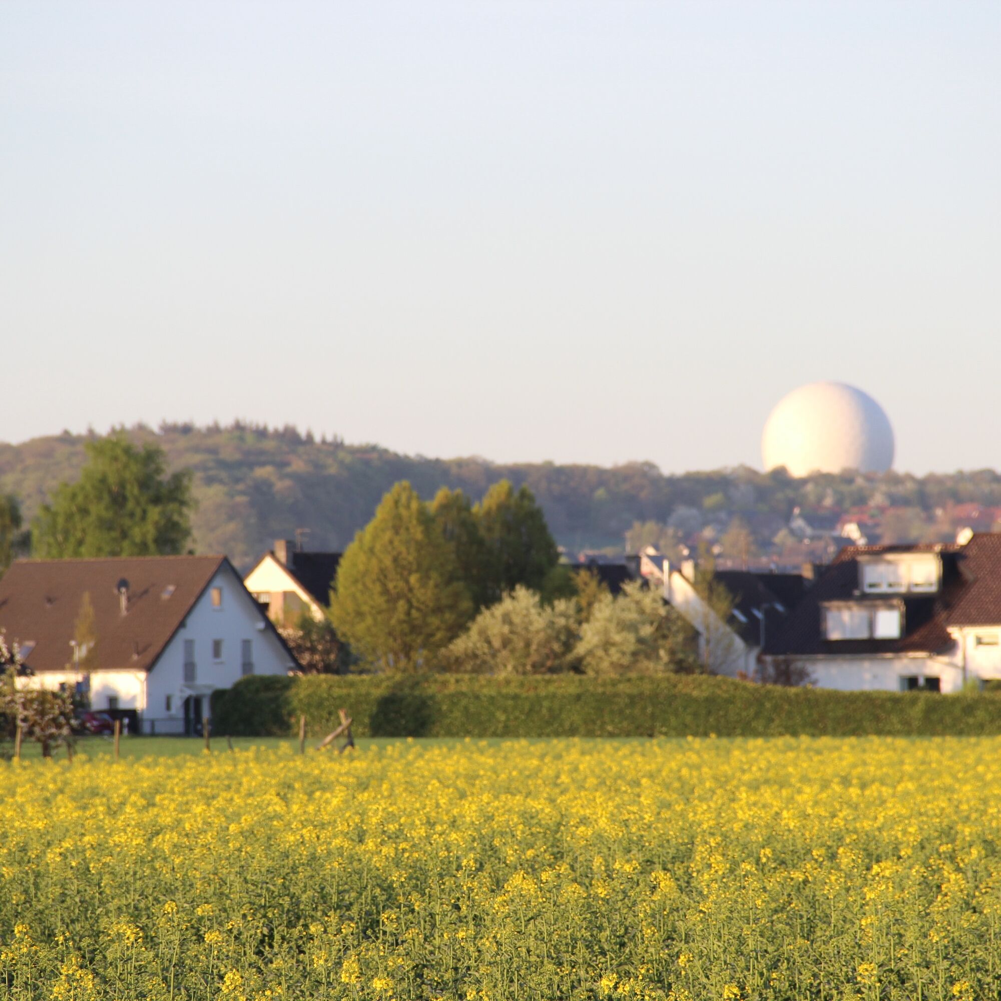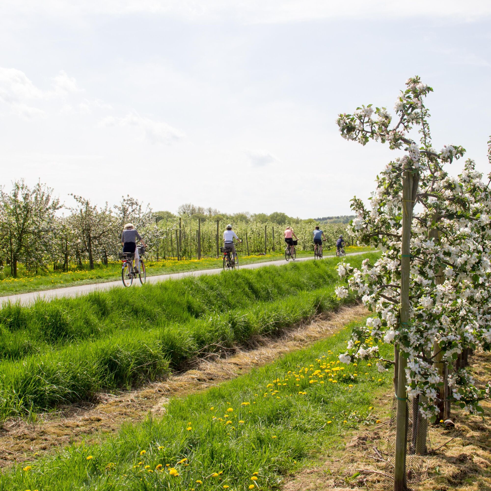 Right outside Alfter, we start with a steep climb up to the high plain of the Rhine terraces. Don’t be alarmed! Unfortunately, this climb cannot be avoided due to traffic conditions and topography and remains a single exception. The reward is breathtaking views and low-traffic cycle paths through apple plantations. Passing through the Alfter districts of Ramelshoven, Volmershoven, and Heidgen, we enter the Kottenforst, the former hunting ground of the Electors of Cologne. On the other side of the forest lies the picturesque Drachenfelser Land. The Rhenish Apple Route passes half-timbered houses, rural charm, and numerous berry and apple plantations. Throughout, you can repeatedly gaze in amazement at the Siebengebirge mountains across the Rhine. By bike, we continue through Berkum, home of the widely visible radar dome (radar cupola of the Fraunhofer Institute), and the potter’s village of Adendorf towards the apple city Meckenheim. Here, countless apple trees characterize the route. The fruit plantations are interrupted by large, park-like nursery fields before entering Meckenheim’s center. After passing the charming village of Lüftelberg, we reach Rheinbach. Rheinbach’s cityscape is shaped by historic buildings but is also a modern economic location and site of the agricultural experimental station of the University of Bonn, Campus Klein Altendorf, which we pass on our route. From the Rheinbach district Oberdrees, we proceed to Swisttal. Characterized by beautiful wide views and vast meadows and fields, we cycle across wide plains with magnificent panoramas. Along the Swist River, a constant murmur of water accompanies us until Castle Heimerzheim, an impressive water castle now used as an event location and hotel. Through Heimerzheim, the Apple Route goes gently uphill onto the Rhine terraces of Bornheim. Downhill through numerous Bornheim districts, we reach the large vegetable fields in the Rhine plain. Fields full of lettuce, asparagus, vast fruit plantations, regional farm shops, and the Rhine offer varied views and many opportunities to marvel and relax. After a short detour to the Rhine, we cycle back to Alfter along the Ville slopes.