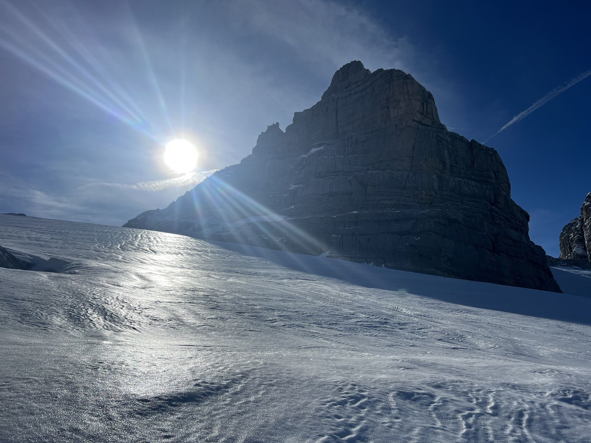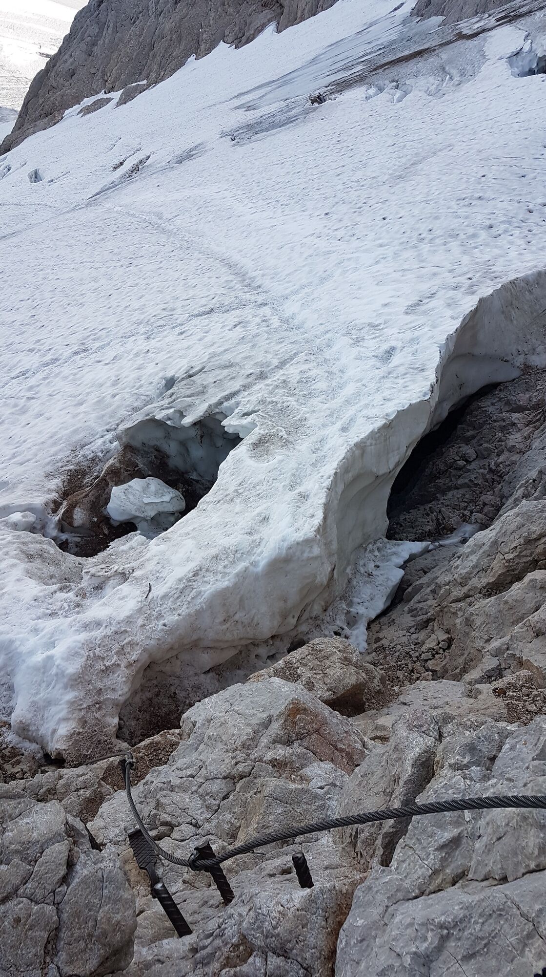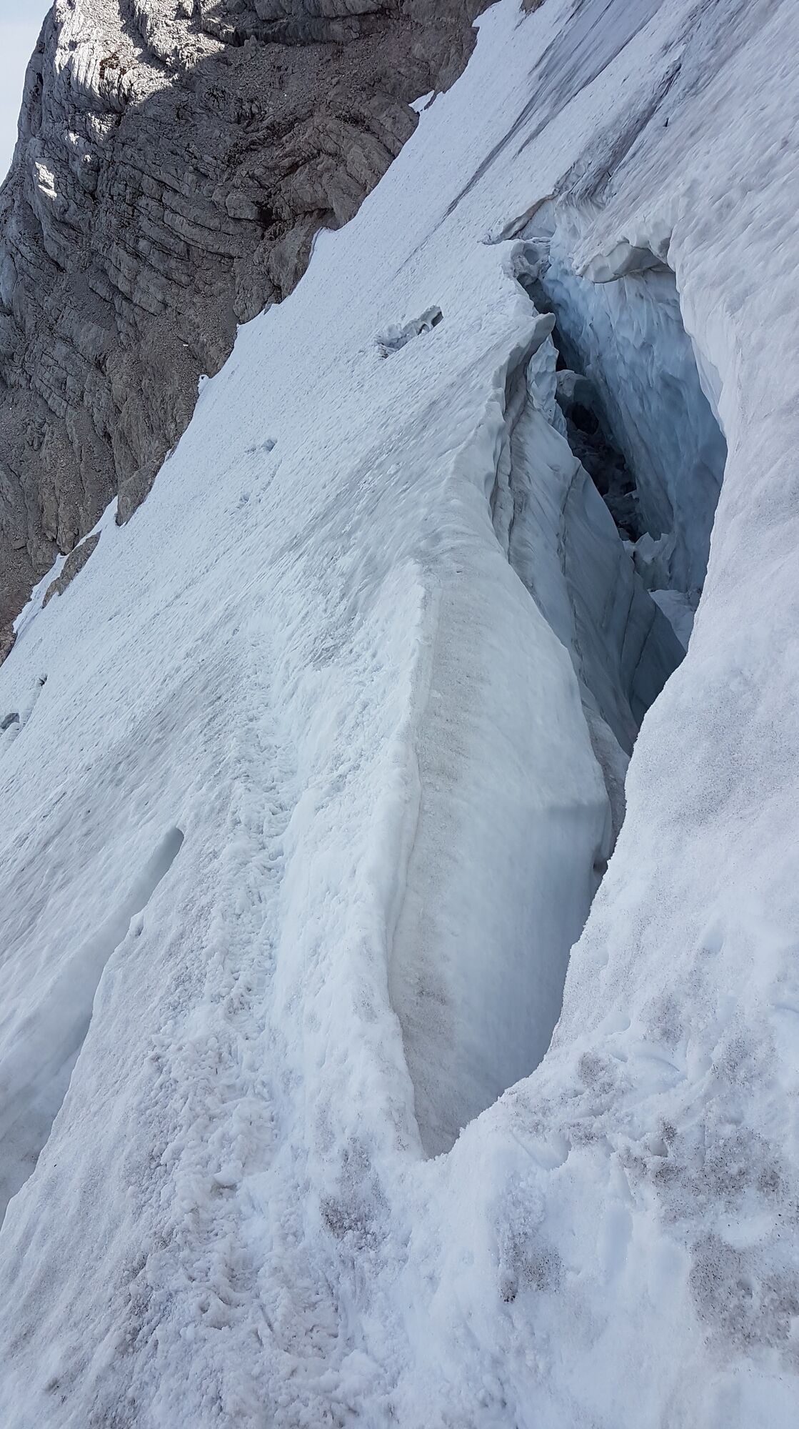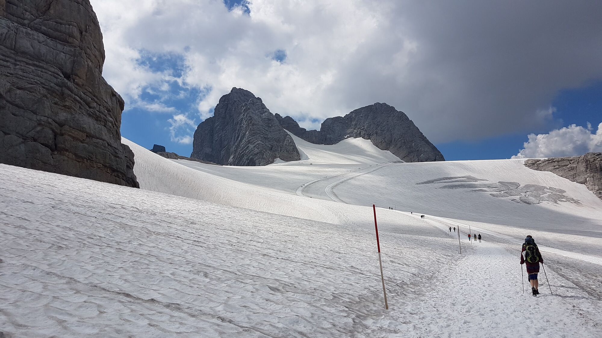 Am Gletscher angekommen ist ja schon mal ein wunderbares Bild. Der Weg bis zum letzten Aufstieg zum Hohen Dachstein über die Ostschulter ist weitgehnst mit der Schneeraube planiert.