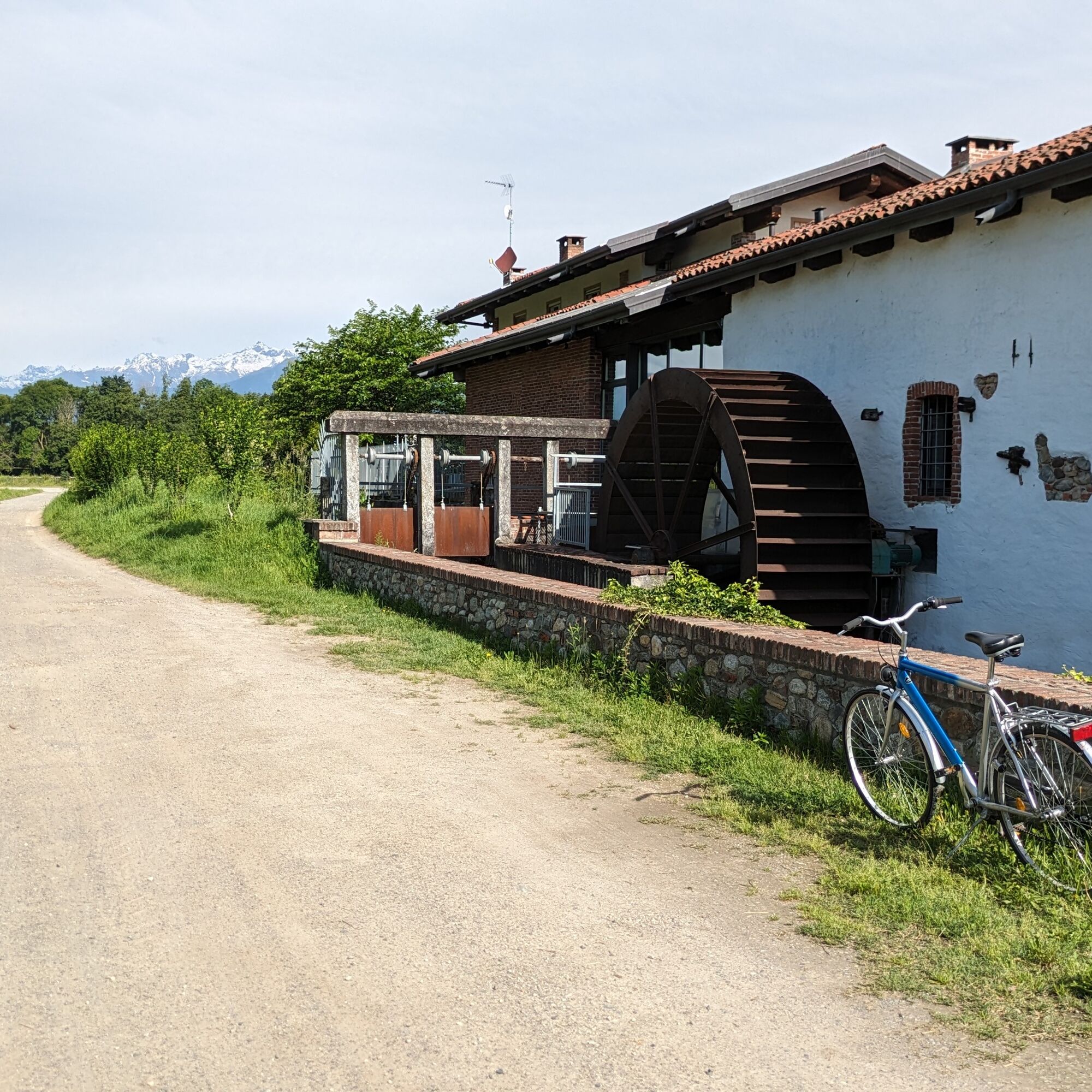 Then turn left onto via Molino: follow the road running alongside the canal, cross the SP 41 and then enter Agliè, passing an old Olivetti factory. Turn left onto via Giuseppe Frua, right onto via del Cimitero and left uphill (via Nazario Ivrea). Then turn right onto via Principe Tommaso (a street with arcades) to reach the square of the Agliè Castle. Continue along the road which later runs again alongside the Caluso canal (possibility to ride a cycle path for a short stretch). Upon reaching the junction with strada Luisetta, leave the road to San Giorgio and continue along the canal for several kilometers. Then you come out onto via missionari Oblati: turn right and shortly after reach the center of San Giorgio Canavese.