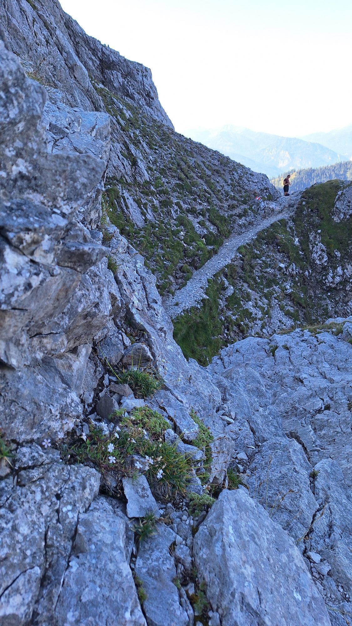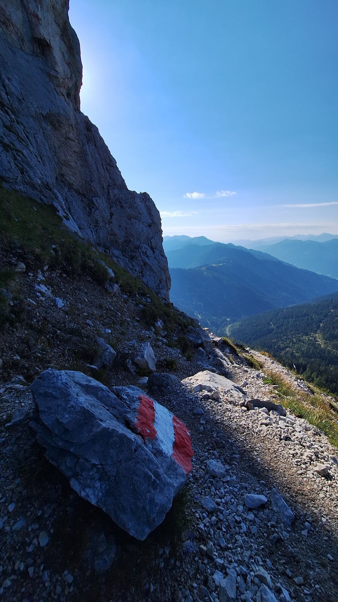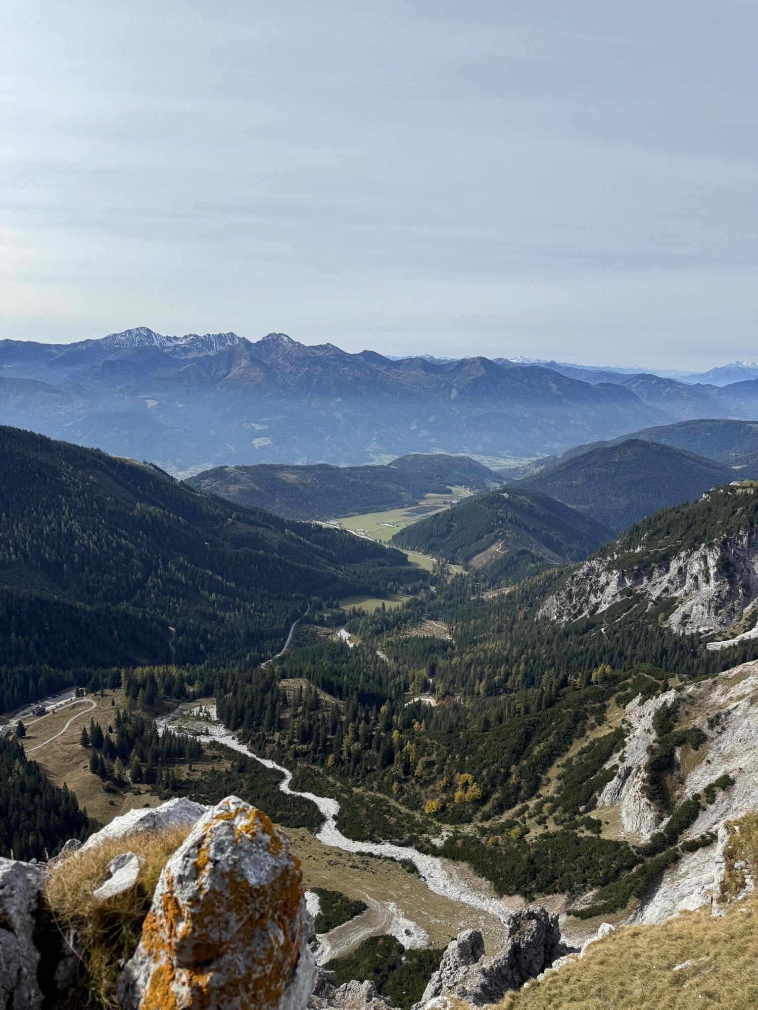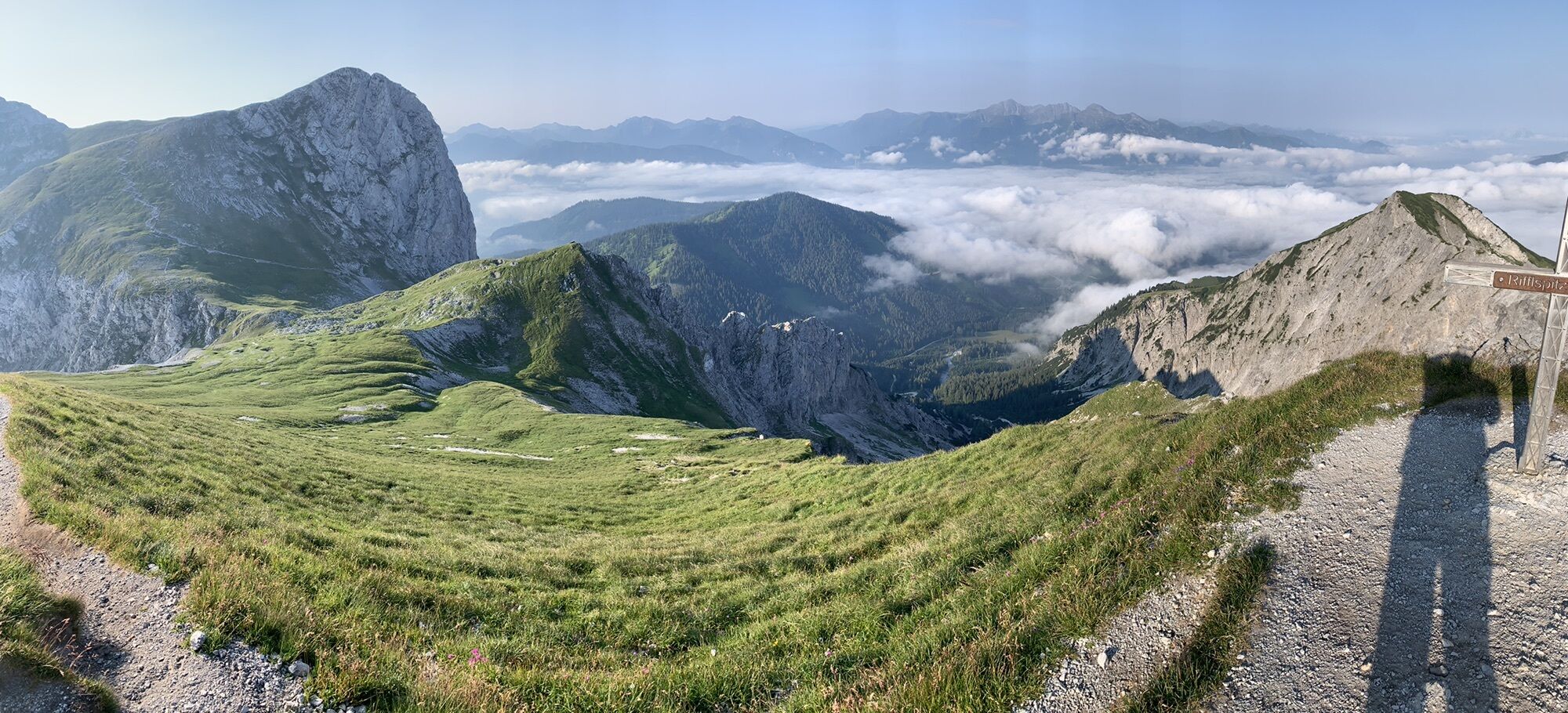 Auf einem geschotterten Pfad führt der Weg hinunter bevor es wieder bergauf Richtung Kalbling geht. Der Abstecher auf den Gipfel des 2.196m hohen Admonter Kalbling lohnt sich auf den jeden Fall und wird einmal mehr mit einer grandiosen Aussicht belohnt. Zurück geht's zunächst auf demselben Weg. Am Rückweg geht's am rechts aufragenden Riffel vorbei Richtung Klinkerhütte. Der Abstieg ist recht schorrtig und erfordert durchaus etwas Konzentration, ist aber grundsätzlich nicht schwierig. Ab der Klinkerhütte wird der Weg zurück zur Kaiserau wieder gemütlicher. Zunächst geht's über einen Waldweg durch einen schattigen Wald. Dieser lichtet sich schließlich und der Weg wird zusehends breiter. Bald kommt man an jender Abzweigung vorbei, die zu Beginn der Tour in Richtung Kreuzkogel führte. Diese lässt man rechts liegen und folgt dem bereits bekannten Weg retour zum Parkplatz Kaiserau.