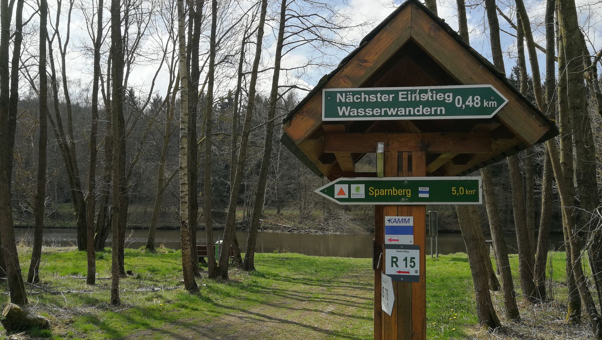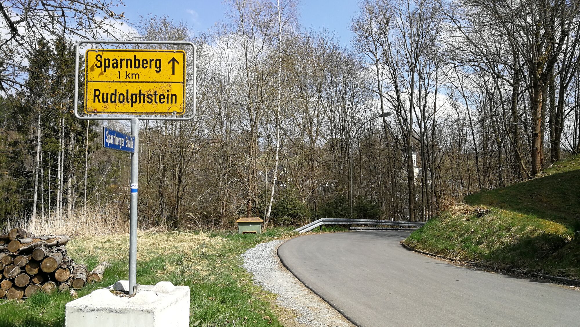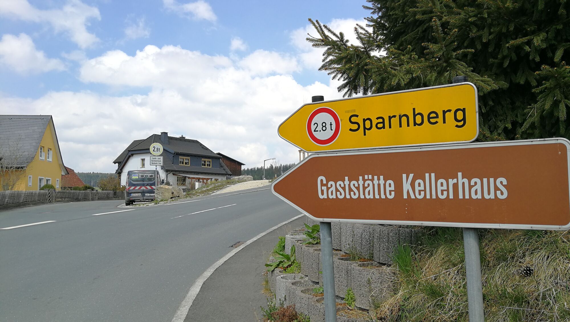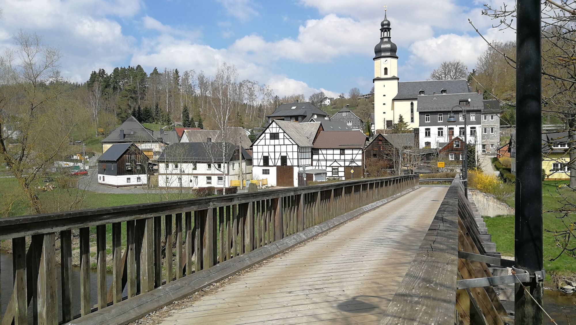 ►►► Als Abstecher steigen wir die Dorfstraße einige Hundert Meter bergan und betrachten das Schlösschen, das zu den vielen Befestigungsanlagen an der Saale gehörte. Weiter oben links befindet sich das Saale-Hotel. Wir gehen wieder zurück, biegen rechts ein und wandern auf der schmalen Straße hinab zur Saale. Vor der 1993 erbauten Holzbrücke (nur für PKW) schauen wir hinüber auf die thüringische Gemeinde Sparnberg mit der restaurierten barocken Kirche und der darüber etwas verstecken Ruine Sparnberg. Als Gründer erscheint 1202 ein Rüdiger von Sparnberg aus dem Geschlecht der Herren von Sparneck (Fichtelgebirge, im Wappen ein Sparren).