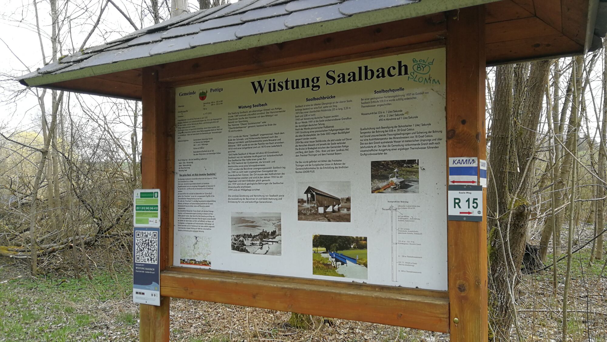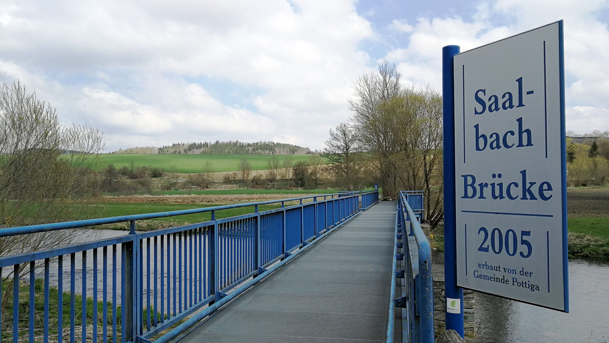 ►►► Wir folgen flussaufwärts dem Bogen der Saale und kommen an die 2005 neu erbaute Saalbachbrücke. Das ehemalige Gut Saalbach wurde im Zuge der Grenzsicherung abgerissen. Mauerreste und die wieder hergestellte Quelle erinnern an das Anwesen. Wir überqueren die Brücke und schreiten hinauf in die fränkische Gemeinde Rudolphstein. Rechts wird die A 9 vom Brückenrasthaus Frankenwald überspannt.