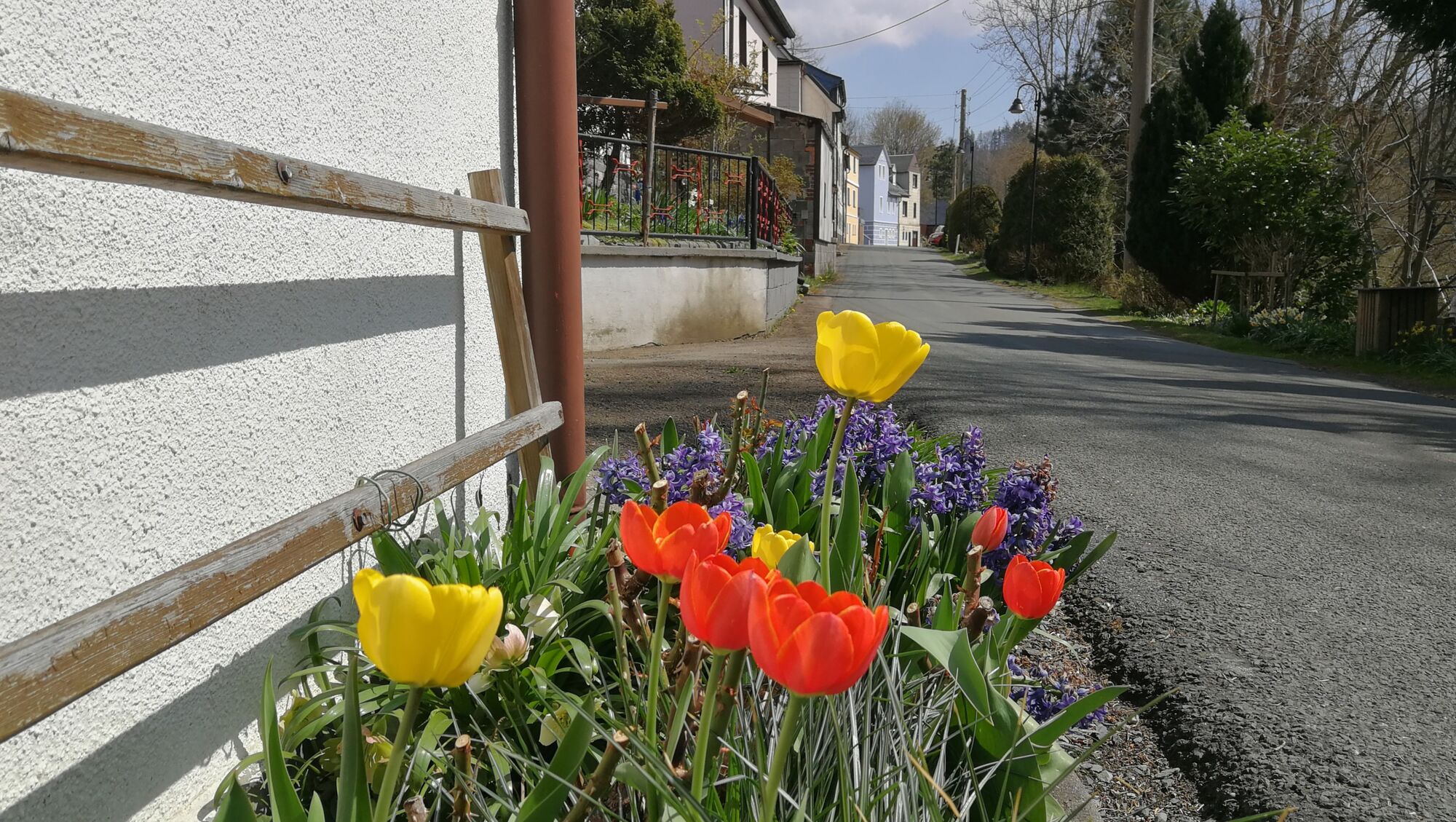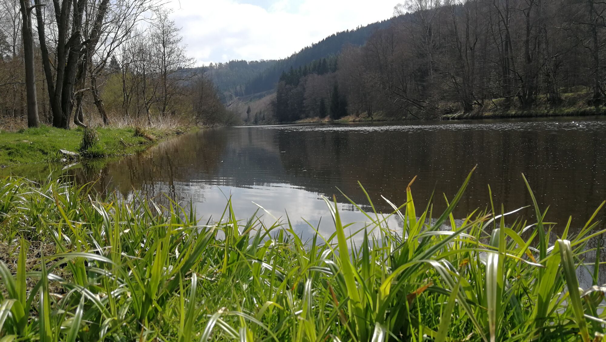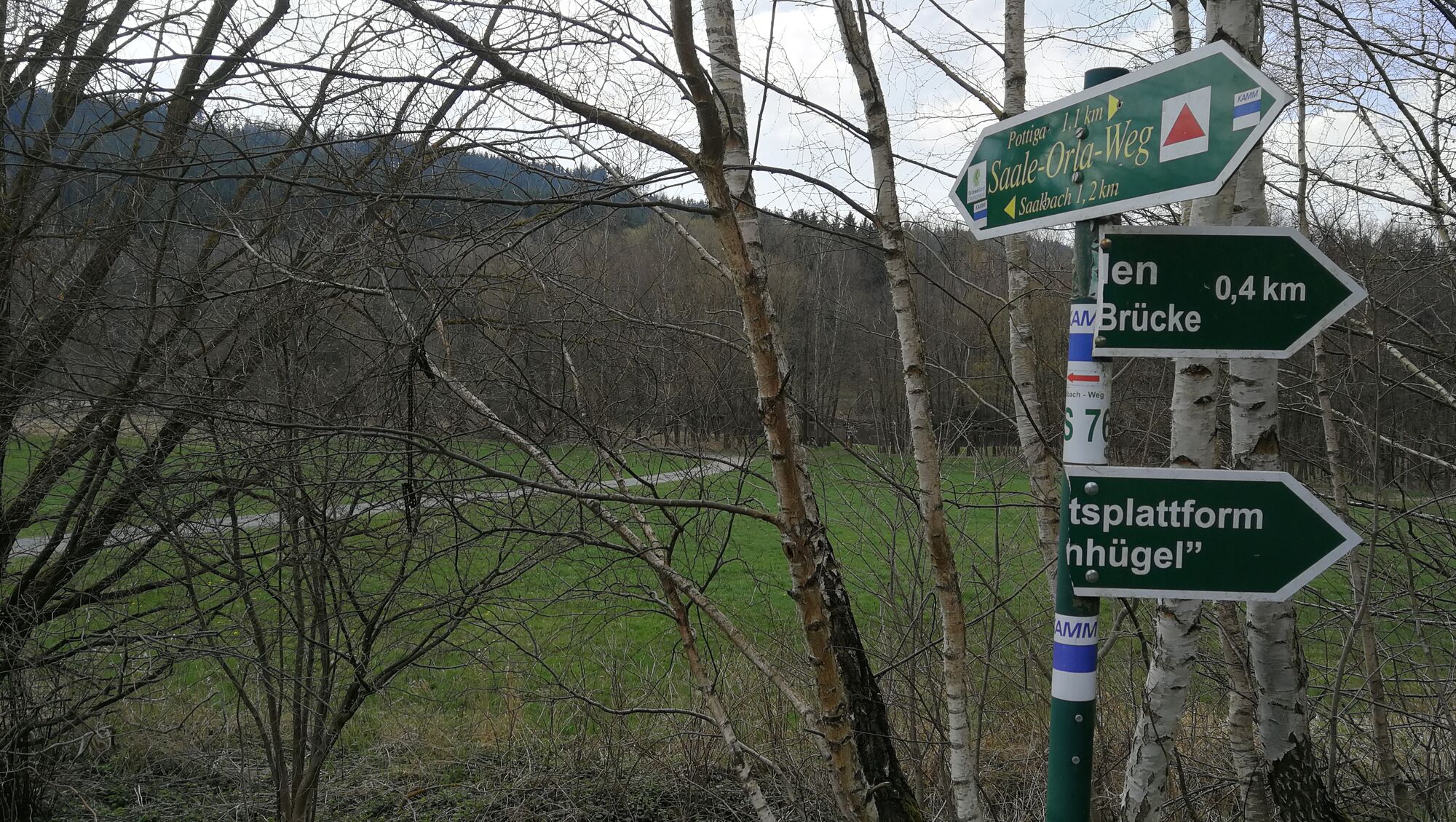 ►►► Wir schlagen vom Markt aus die Richtung nach Sparnberg ein und biegen am Ortsrand nach rechts in einen Feldweg ein (von hier bis zur Saalbachbrücke Saale-Orla-Weg (Saale-Orla-Weg, US76). Von einer kleinen Anhöhe schlängelt sich der Weg hinab ins Saaletal. Die Saale, der schönste und bedeutendste Fluss Thüringens, bildet hier die Landesgrenze zwischen Thüringen und Bayern. Jenseits des Flusses steigt der bewaldete Hang hinauf zum Gupfen (612 m).