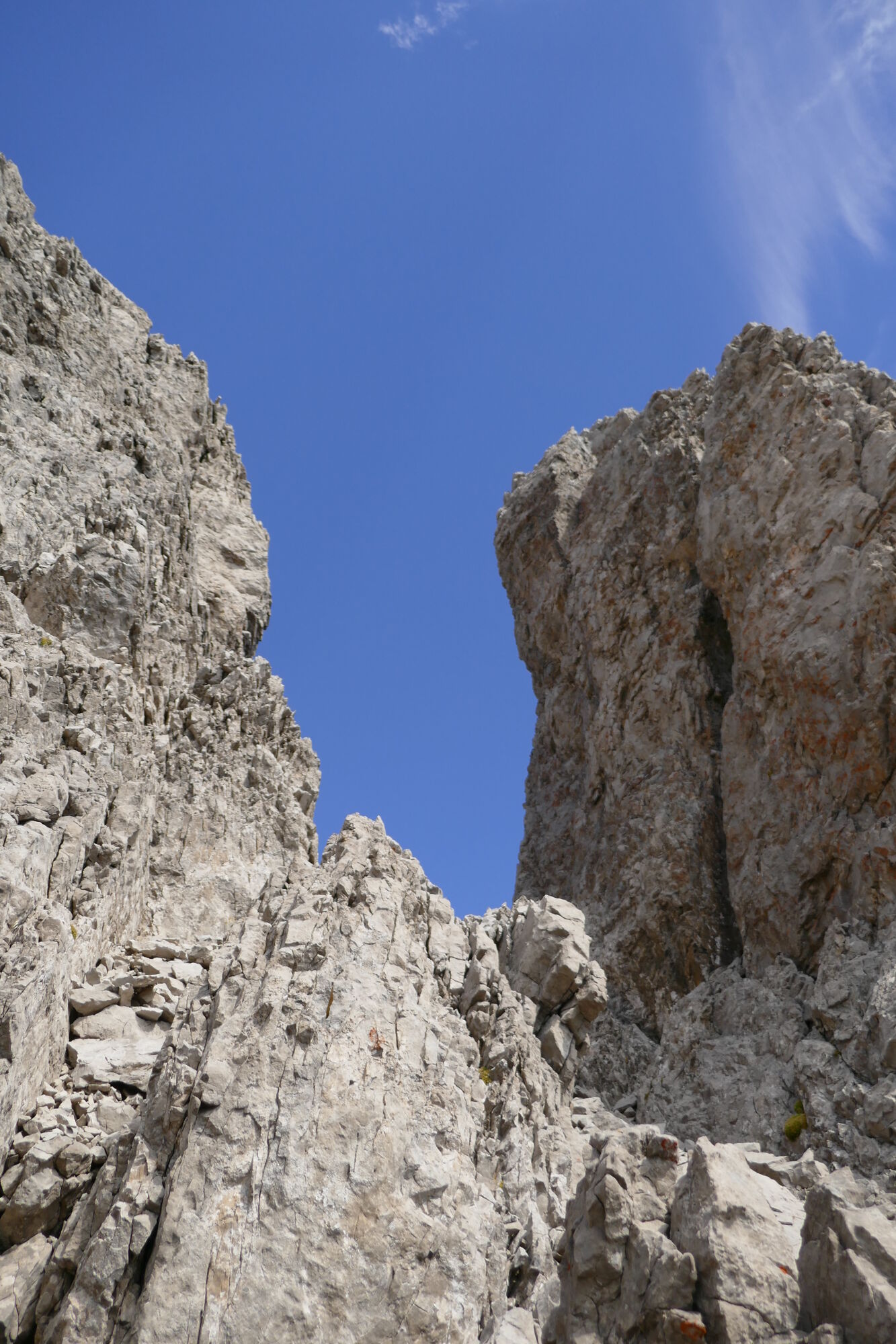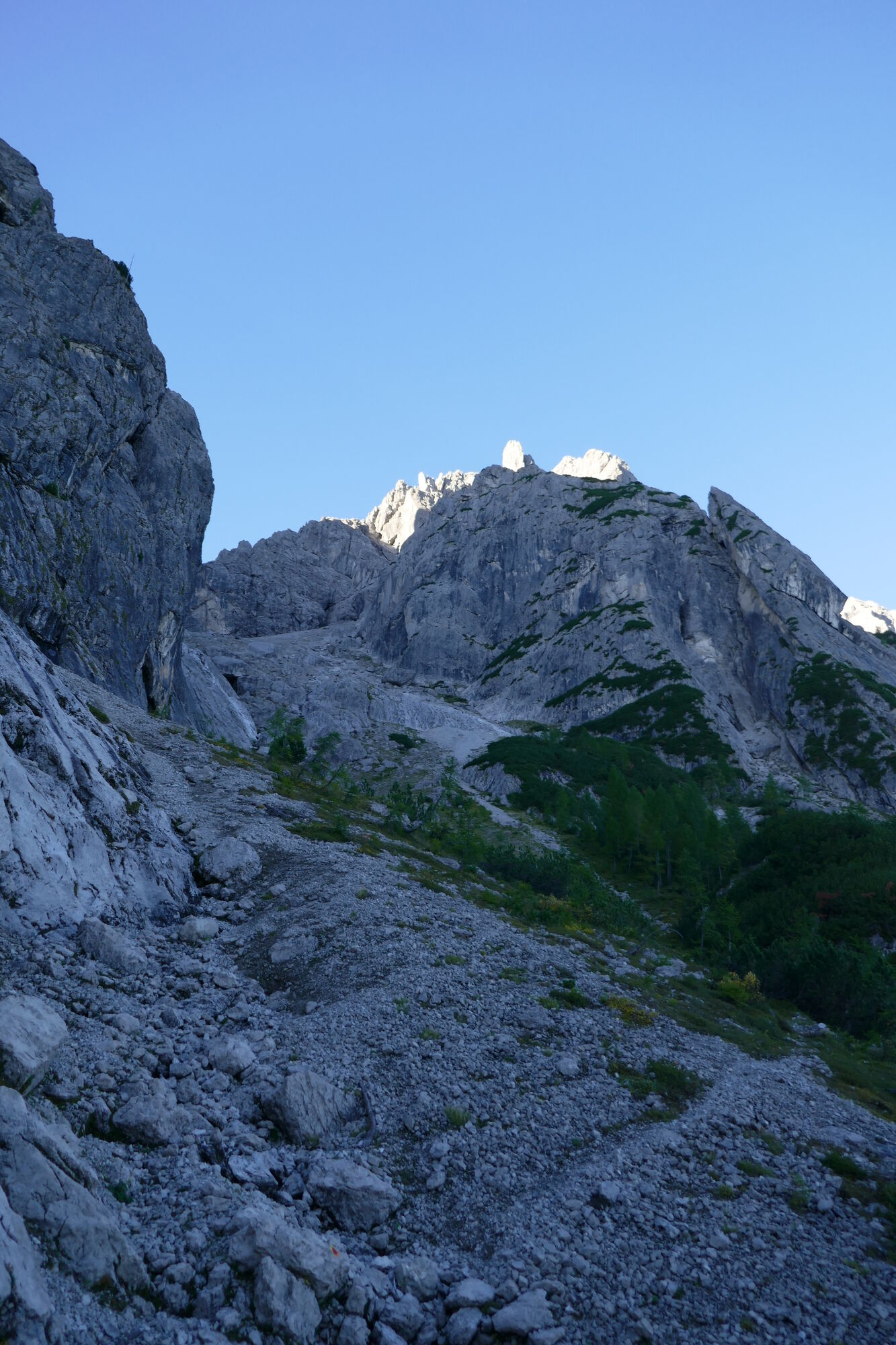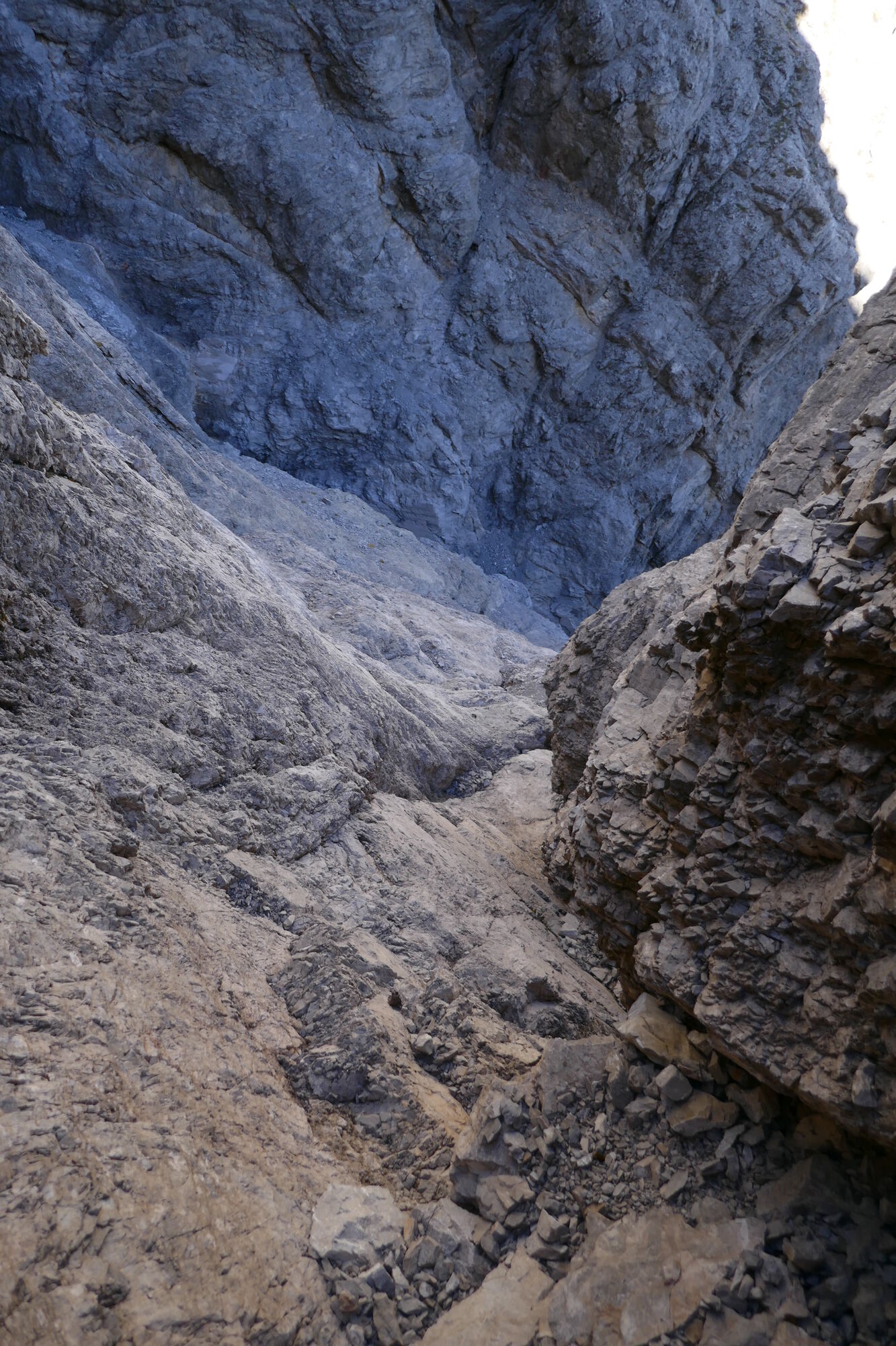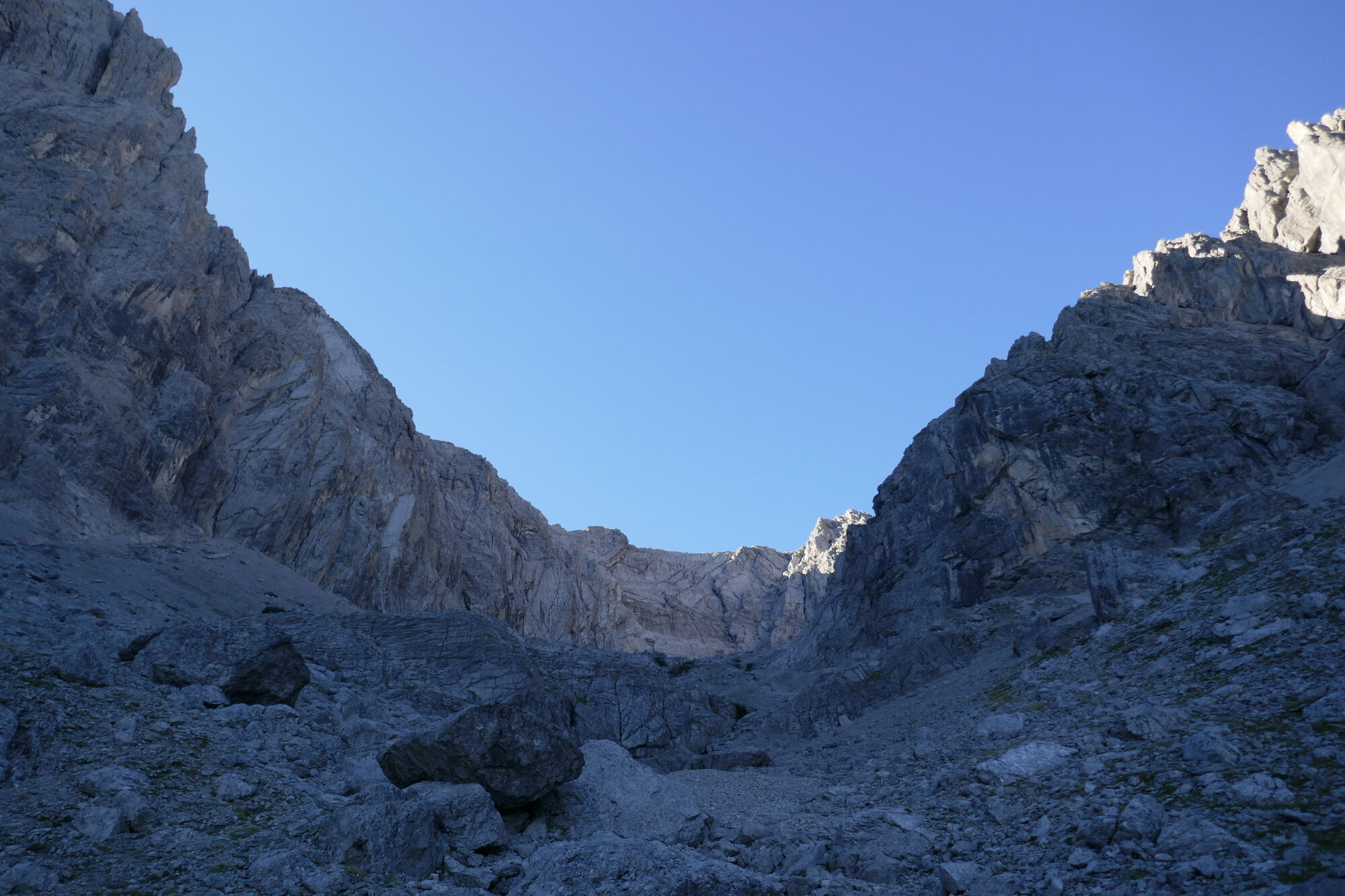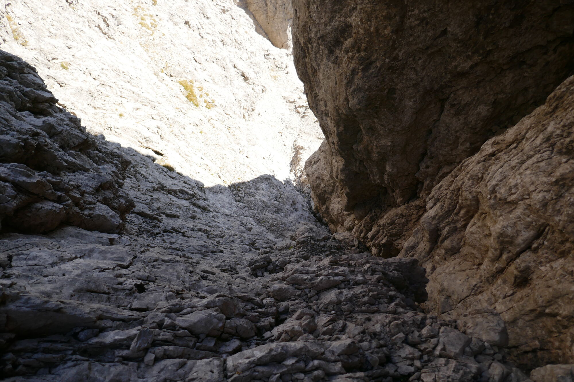 Ab hier sind es gut 600hm bis zur Schlucht, welche dann zum Schartenschartl führt. Ich habe mich meistens rechter Hand gehalten, ab und an gelbe Markierungspunkte gesehen, welche sich jedoch wieder verloren haben. In dem Bereich wo sich das Kar verengt, habe ich einen großen Fels mit einer kleinen Höhle oberhalb gequert, von dort immer direkt unterhalb der Felswände entlang bis ich im oberen Bereich dann direkt zum Einstieg der Schlucht aufgestiegen bin (etwas mühsam da hier das Gestein lose aufliegt).
