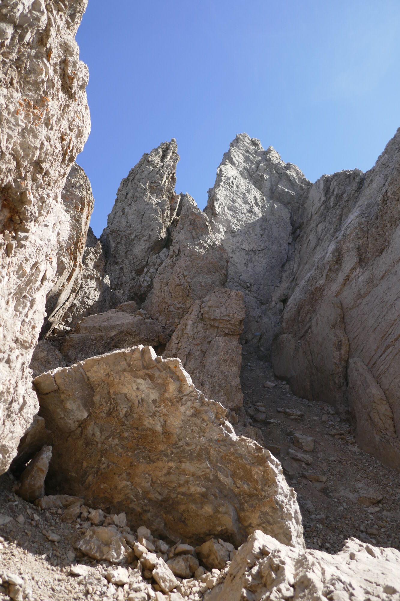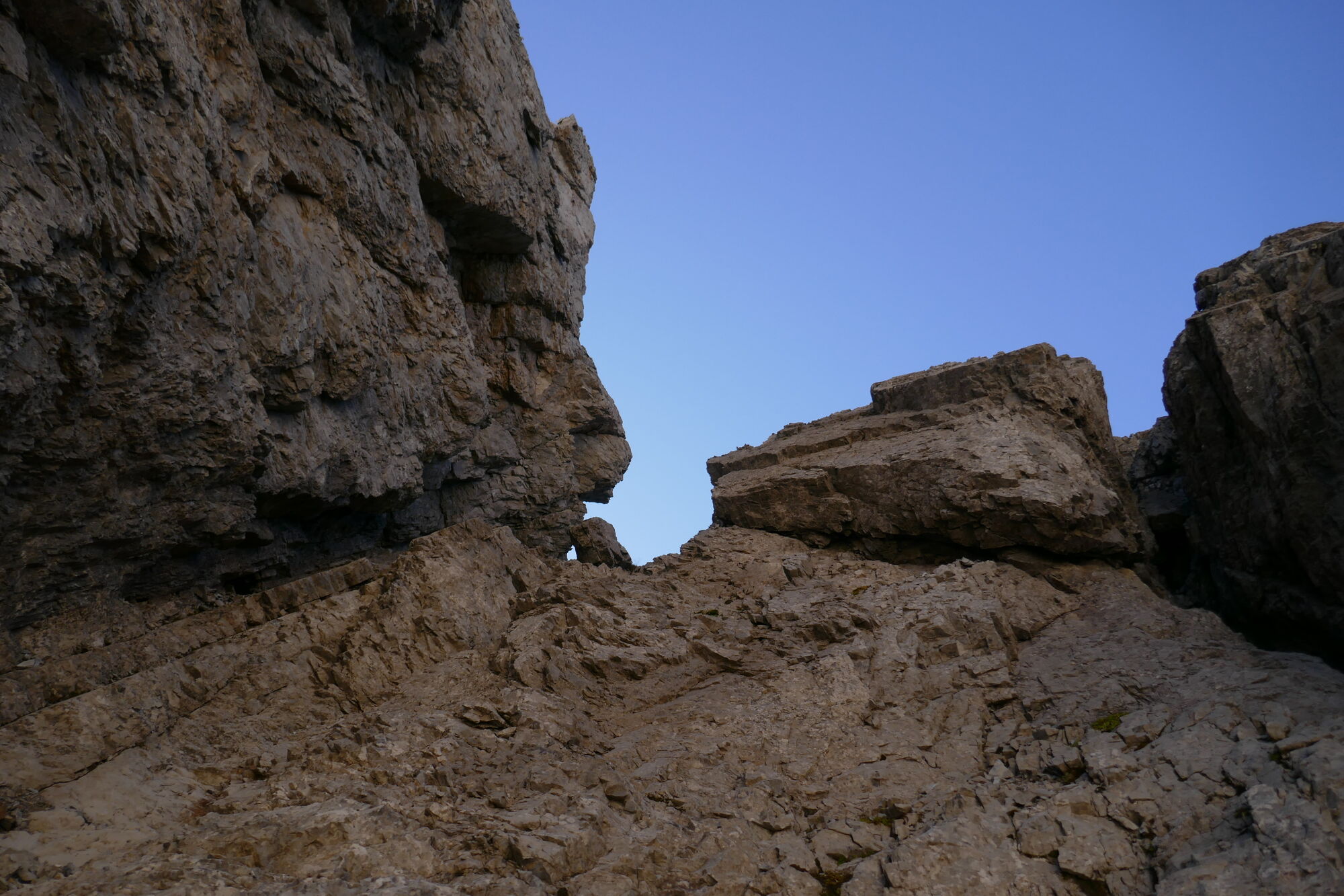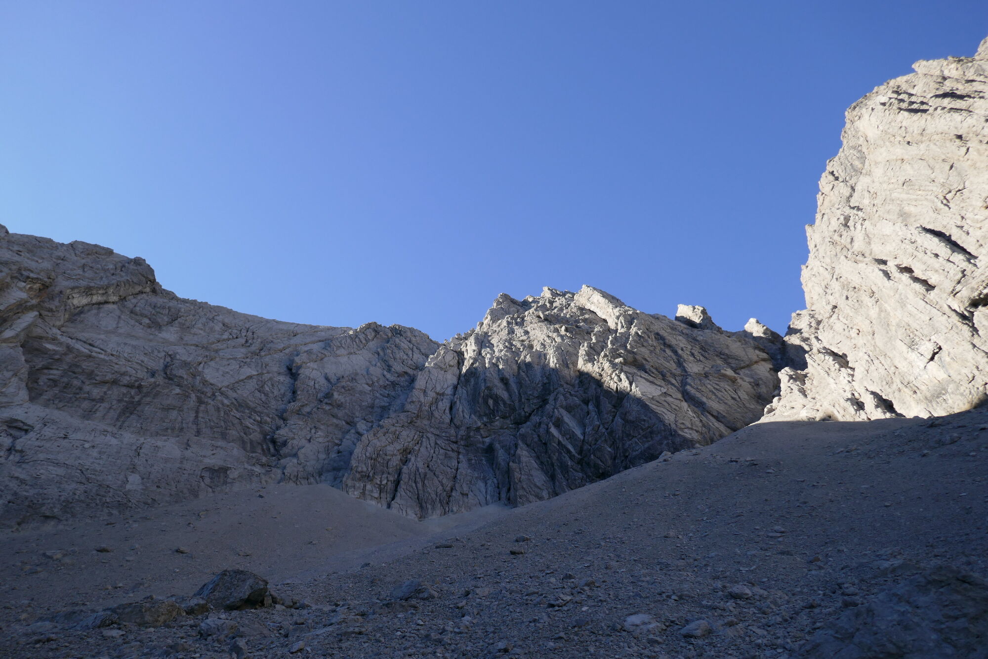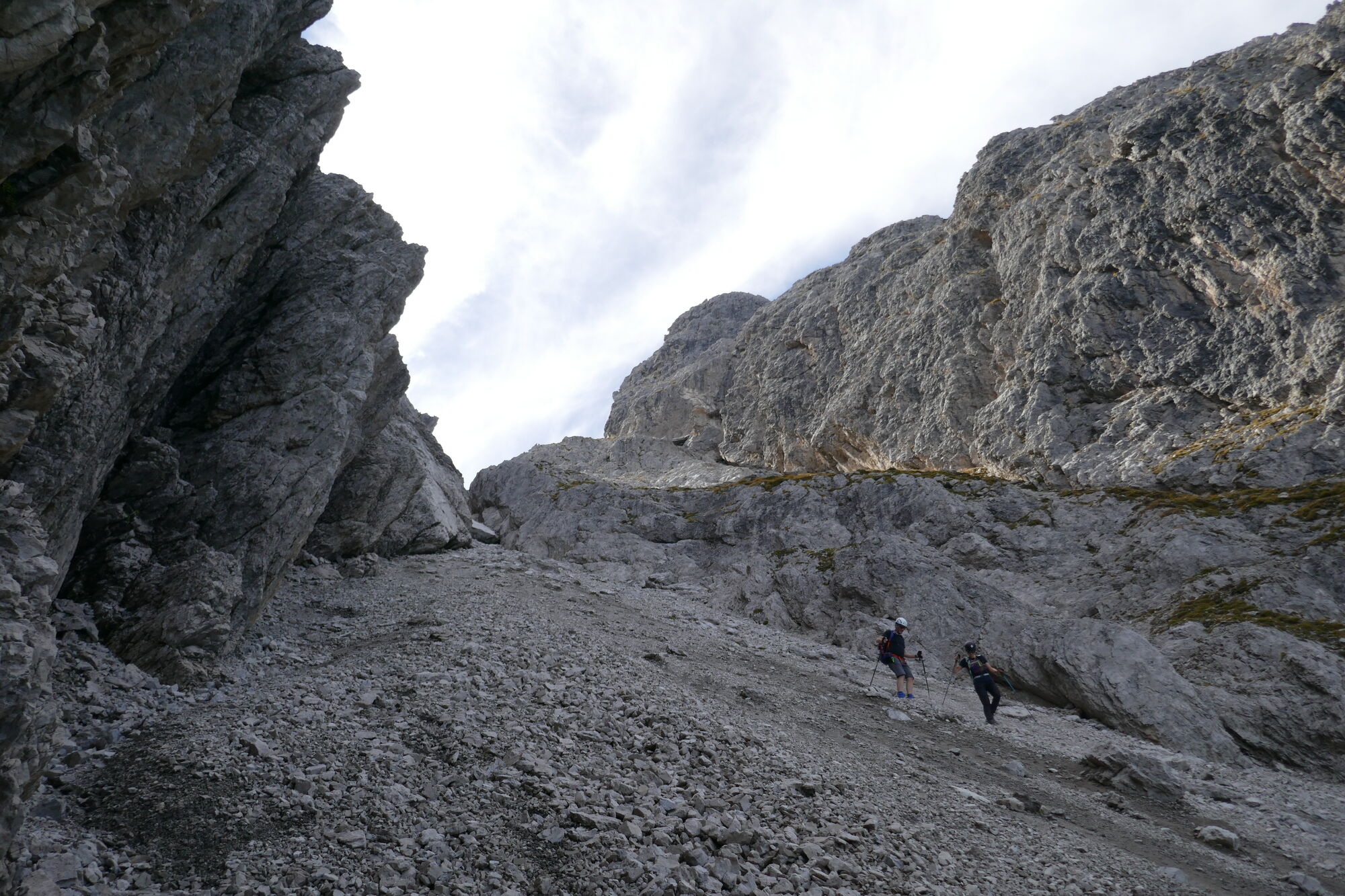 Ab hier sind es gut 600hm bis zur Schlucht, welche dann zum Schartenschartl führt. Ich habe mich meistens rechter Hand gehalten, ab und an gelbe Markierungspunkte gesehen, welche sich jedoch wieder verloren haben. In dem Bereich wo sich das Kar verengt, habe ich einen großen Fels mit einer kleinen Höhle oberhalb gequert, von dort immer direkt unterhalb der Felswände entlang bis ich im oberen Bereich dann direkt zum Einstieg der Schlucht aufgestiegen bin (etwas mühsam da hier das Gestein lose aufliegt).