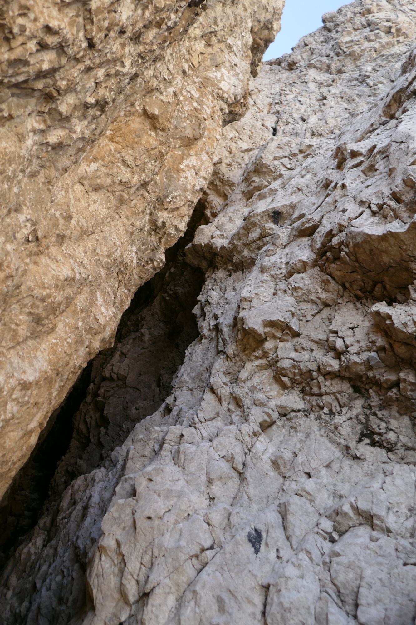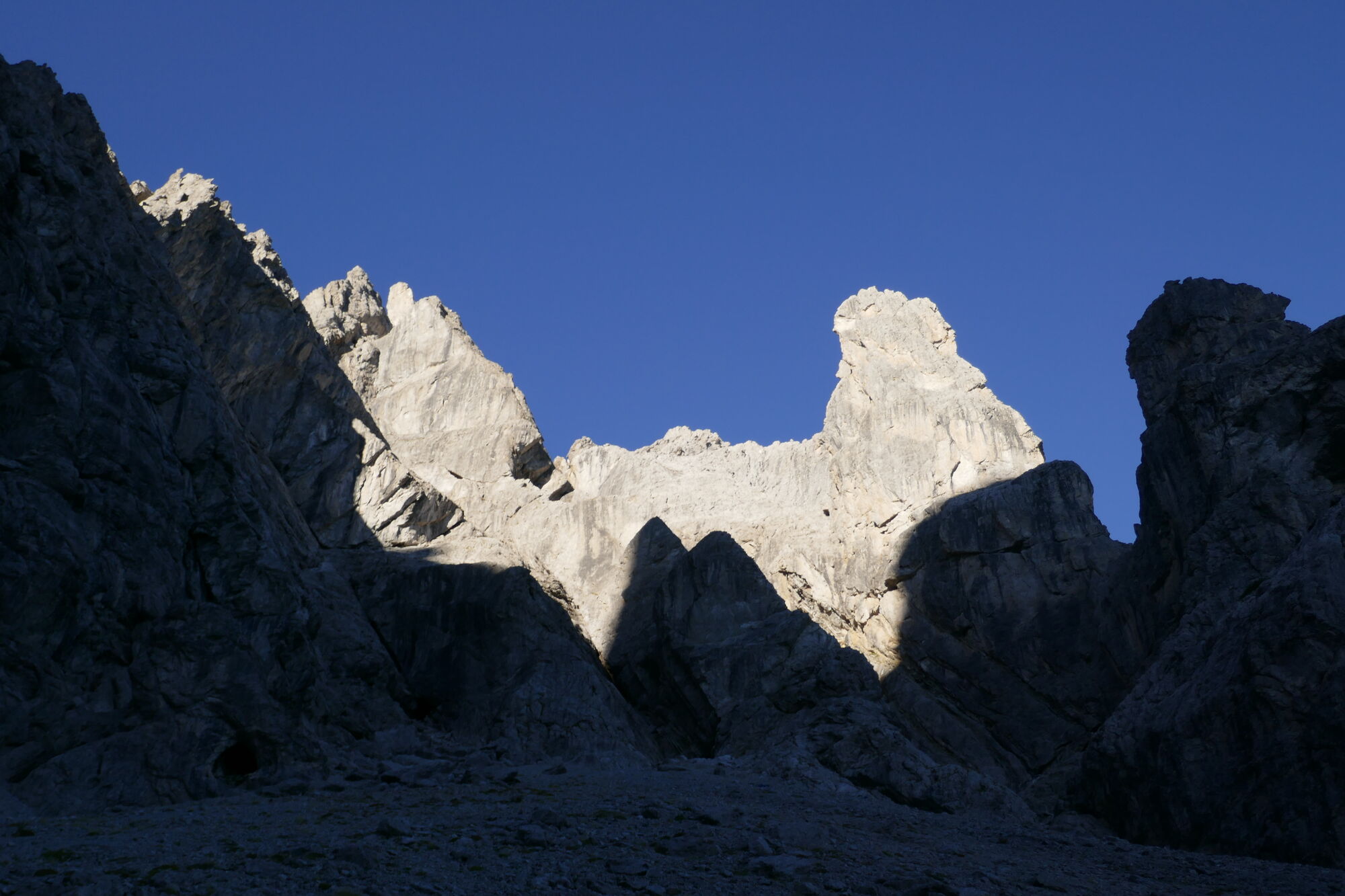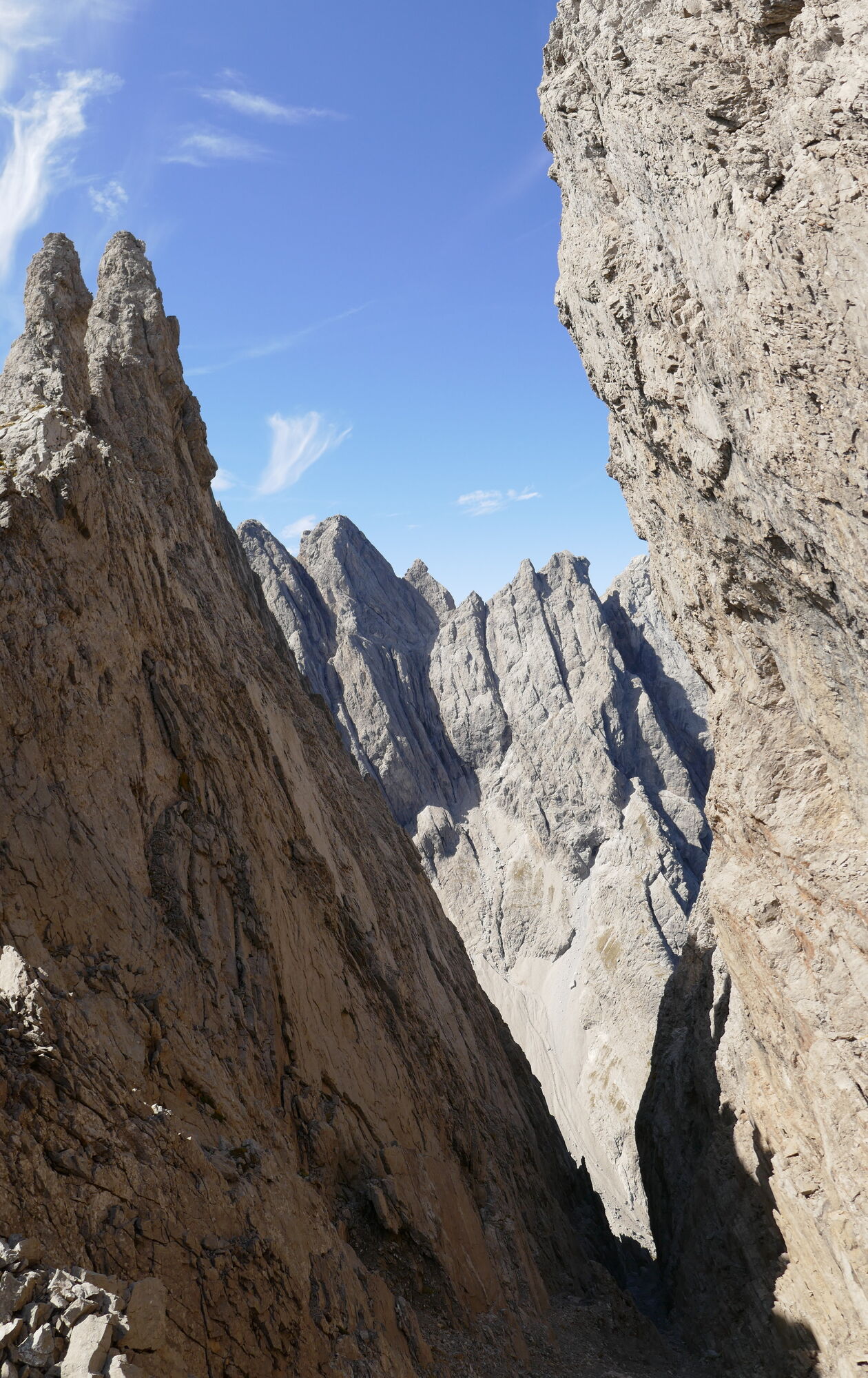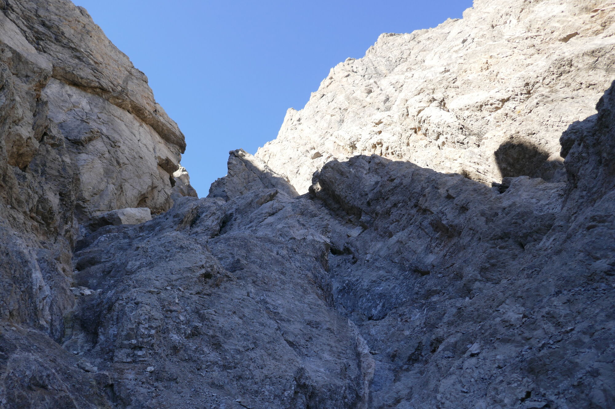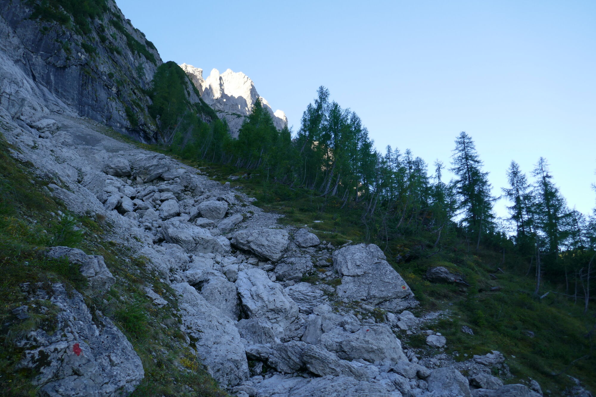 Ab hier sind es gut 600hm bis zur Schlucht, welche dann zum Schartenschartl führt. Ich habe mich meistens rechter Hand gehalten, ab und an gelbe Markierungspunkte gesehen, welche sich jedoch wieder verloren haben. In dem Bereich wo sich das Kar verengt, habe ich einen großen Fels mit einer kleinen Höhle oberhalb gequert, von dort immer direkt unterhalb der Felswände entlang bis ich im oberen Bereich dann direkt zum Einstieg der Schlucht aufgestiegen bin (etwas mühsam da hier das Gestein lose aufliegt).