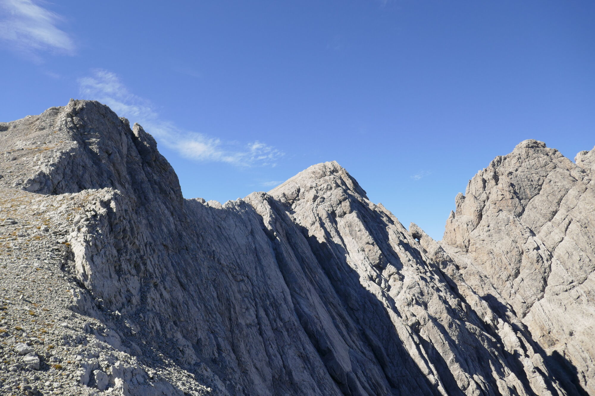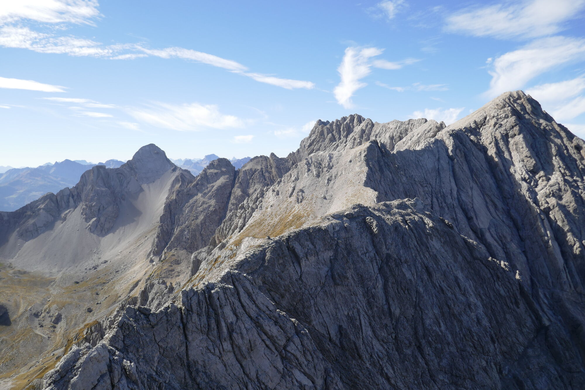 Weiter über schönen, festen Fels direkt über den Nordwestgrat zum Gipfel der Lavanter Gamswiesenspitze. Unschwierig steigt man vom Gipfel über Schrofengelände zum sich zuspitzenden Grat ab. Unschwierig wird dieser bis zum Schartenkammeck überschritten. Vom Schartenkammeck geht es leicht weiter (etwas hinab) zu einem Flachstück. Nach dem Flachstück immer leicht rechts des Gratrückens absteigen bis zu einem kleinen Absatz, von dort dann über schöne Rissstrukturen in festem Fels in den Schartenkammsattel absteigen.