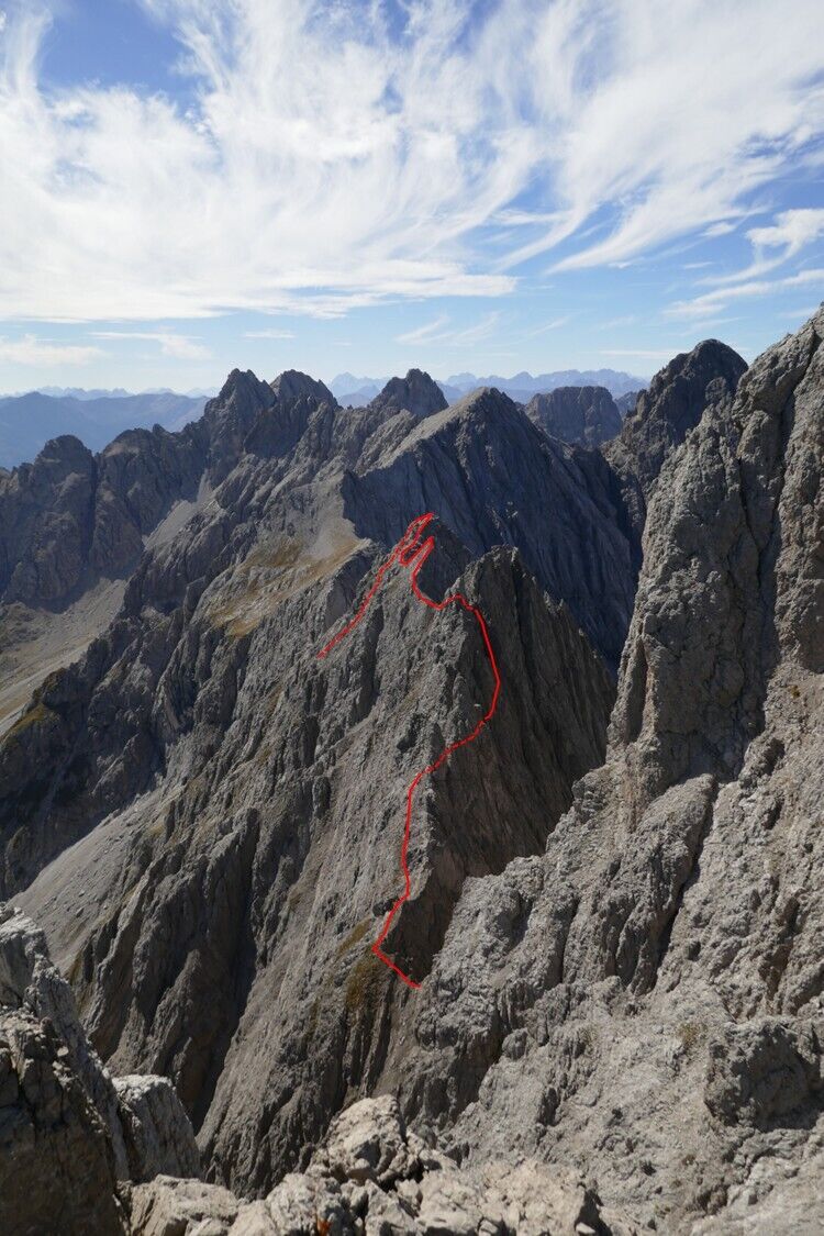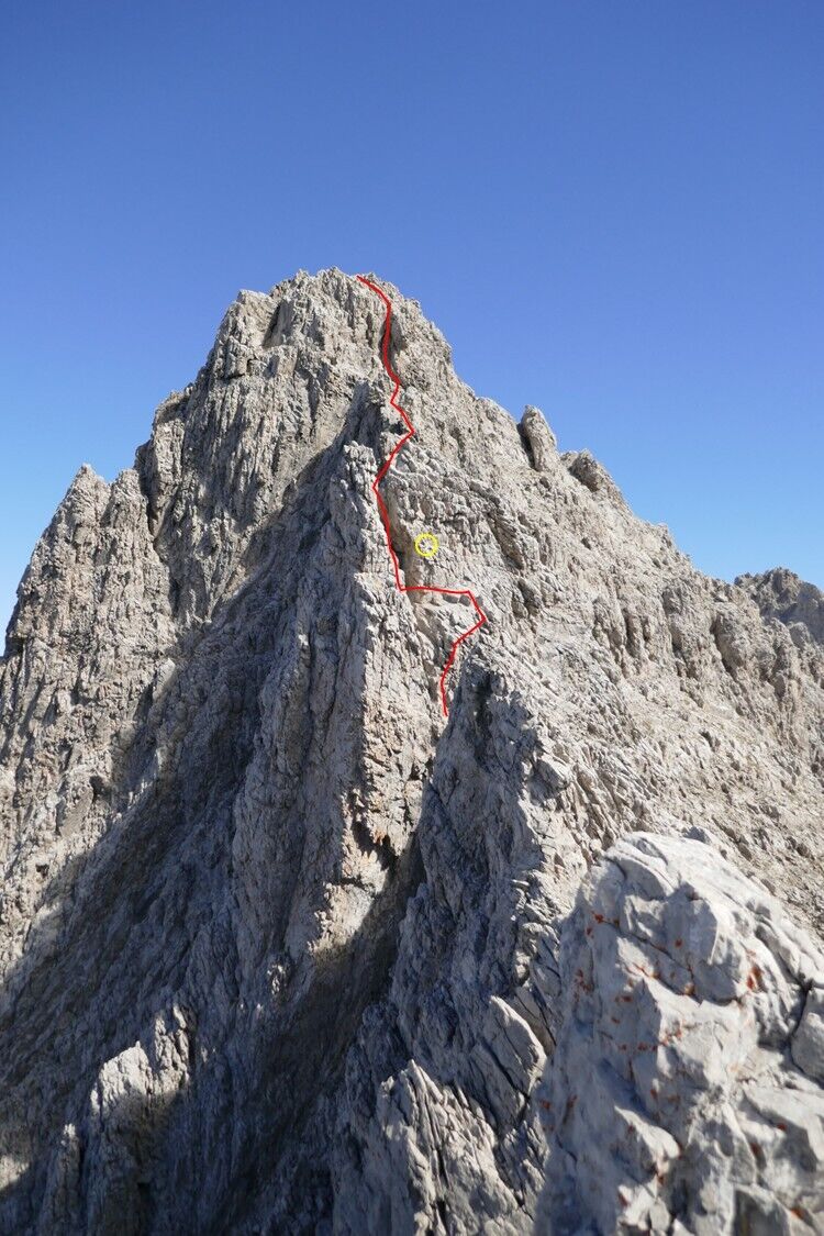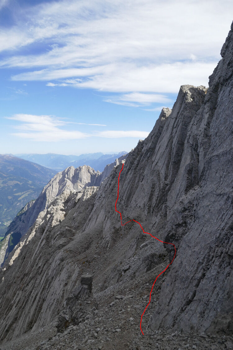 Anfangs leicht rechtshaltend über gestuftes, etwas plattiges Gelände um rechts an der großen rötlichen Wand vorbeizukommen. Dahinter schluchtartig befindet sich ein steiler,enger Kamin und eine etwa 5 Meter hohe steile Wand die es noch zu bewältigen gibt, bevor man über gestuftes Schrofengelände zum Gipfel steigt.