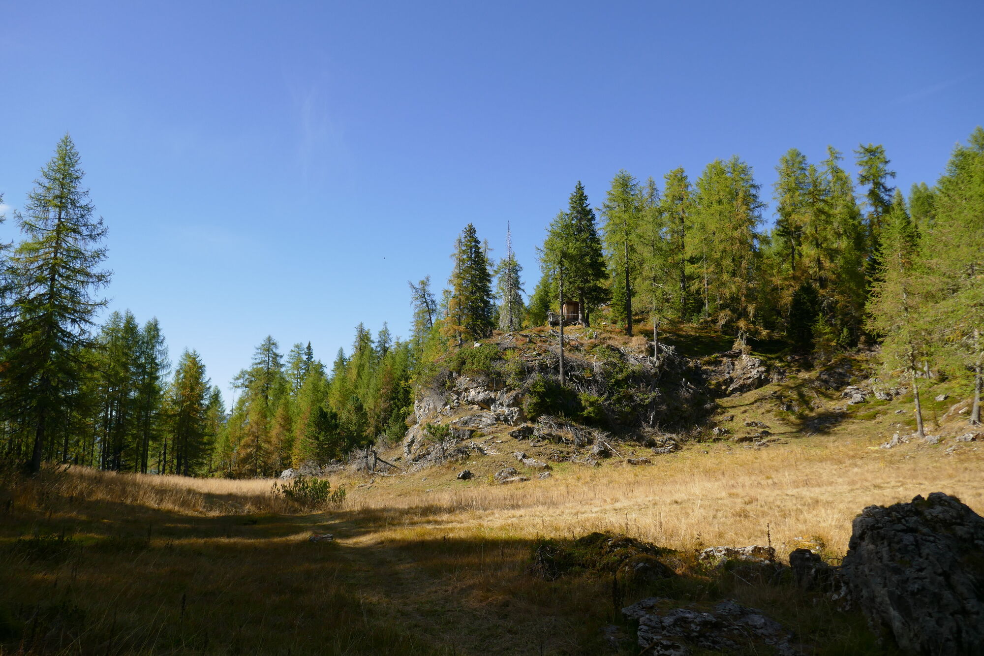 Anfangs der Forststraße bzw. der Mautstraße wie auf der Karte ersichtlich folgen und von der Mautstraße dann links der Bezeichnung "Große Keilspitze" bis zum Lavanter Alpl folgen. Nach der Hütte führt der Steig deutlich rechts in den Wald hinauf bis er sich schließlich zweigt. Wenn sich das Gelände öffnet ist ein Steig zu erkennen, der rechts ins Steinkar führt. In leichtem auf und ab quert dieser unterhalb der Felswände nach Westen. Nachdem man das Dorfbachl gequert hat, führt der Steig aufwärts und bevor man dann ohne Steigung weiter nach Westen quert, kann man Steigspuren erkennen die nach links abzweigen (~1800m); diesen folgt man dann ins Steinkar.