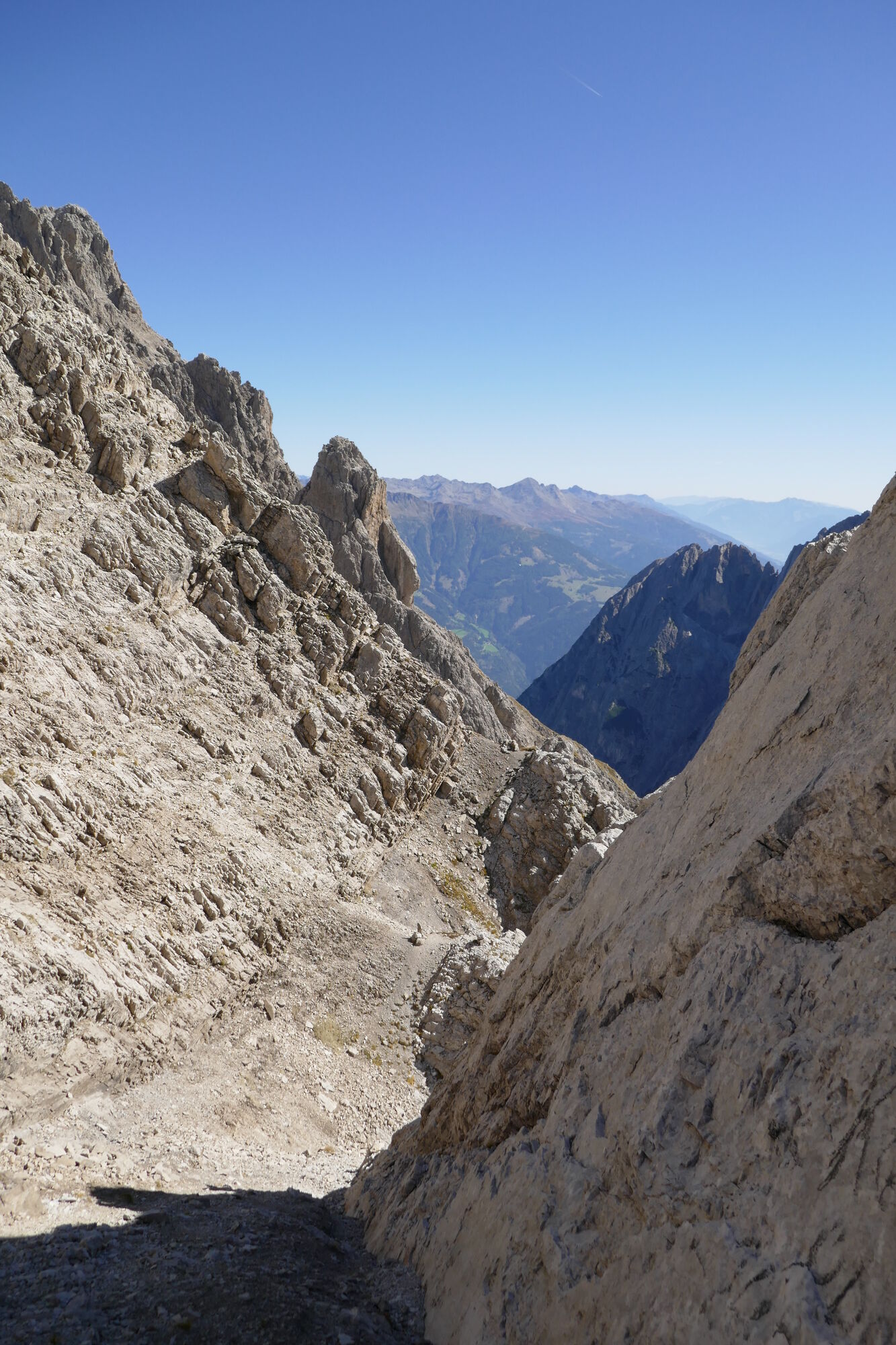 Der Anfang der Schlucht ist recht einfach und das Gestein noch fest - die Beschreibung im Alpenvereinsführer Lienzer Dolomiten 2. Auflage 1984 war für mich nicht wirklich nachvollziehbar und daher bin ich die ersten beiden Steilstufen in der Schlucht rechts in äußert brüchigem Gelände umgangen. bei der dritten Steilstufe habe ich keine andere Möglichkeit gefunden als links über die Platten zum Nordwestgrat der Lavanter Gamswiesenspitze auszusteigen. Beim nachträglichen durchsehen der Fotos konnte ich rechts an der Ostwand der Sandspitze eine Art Band erkennen - vermutlich wird dies im Führer als "Sporn" gedeutet. man steigt dann über einen Kamin in das Schartenschartl ab - welche Variante die bessere ist, muss jeder individuell vor Ort entscheiden!