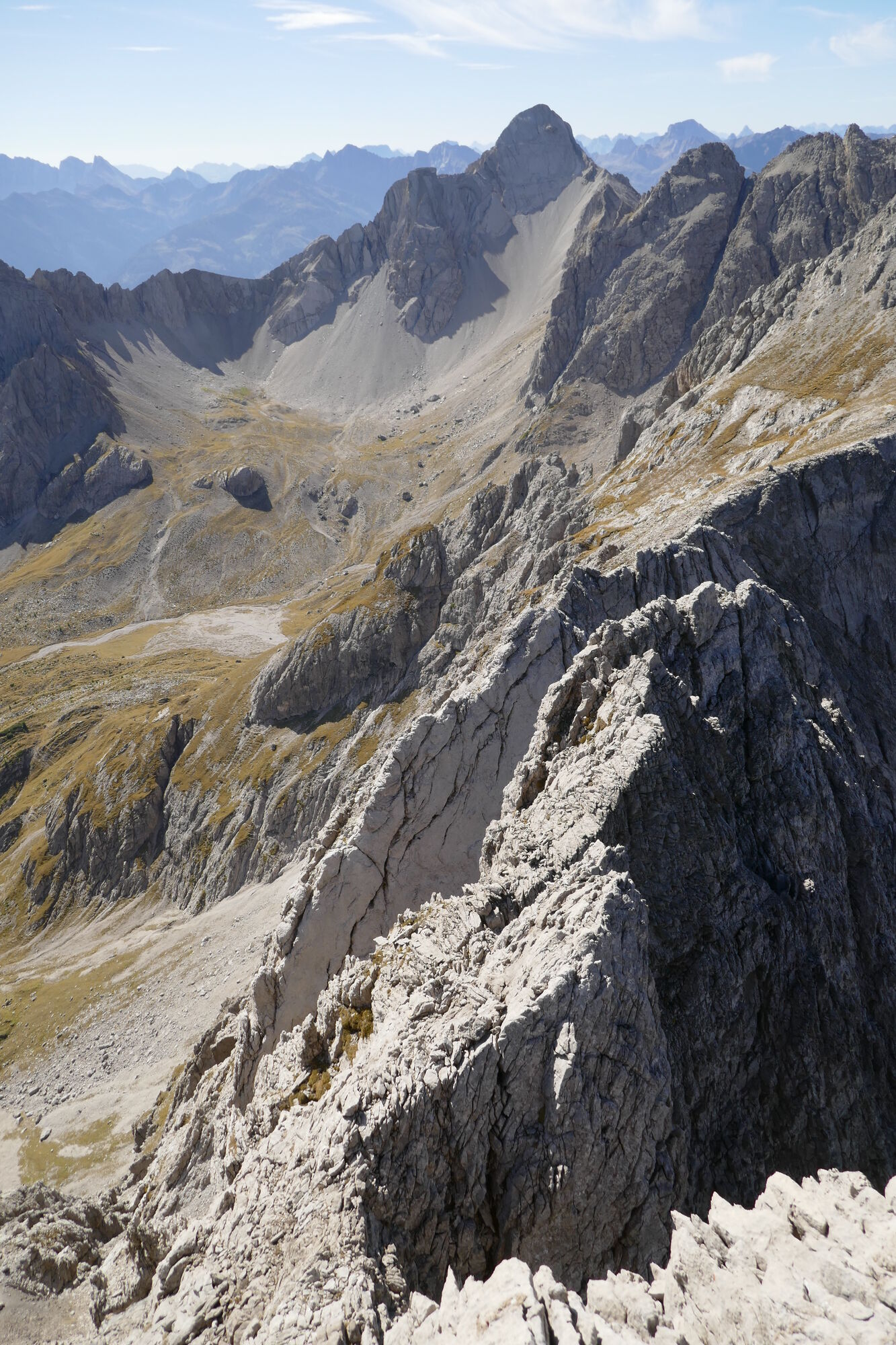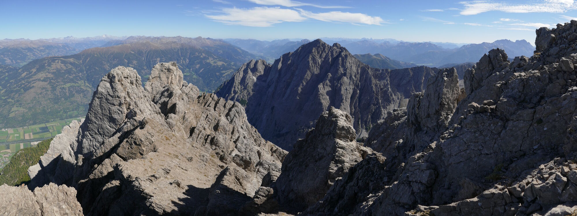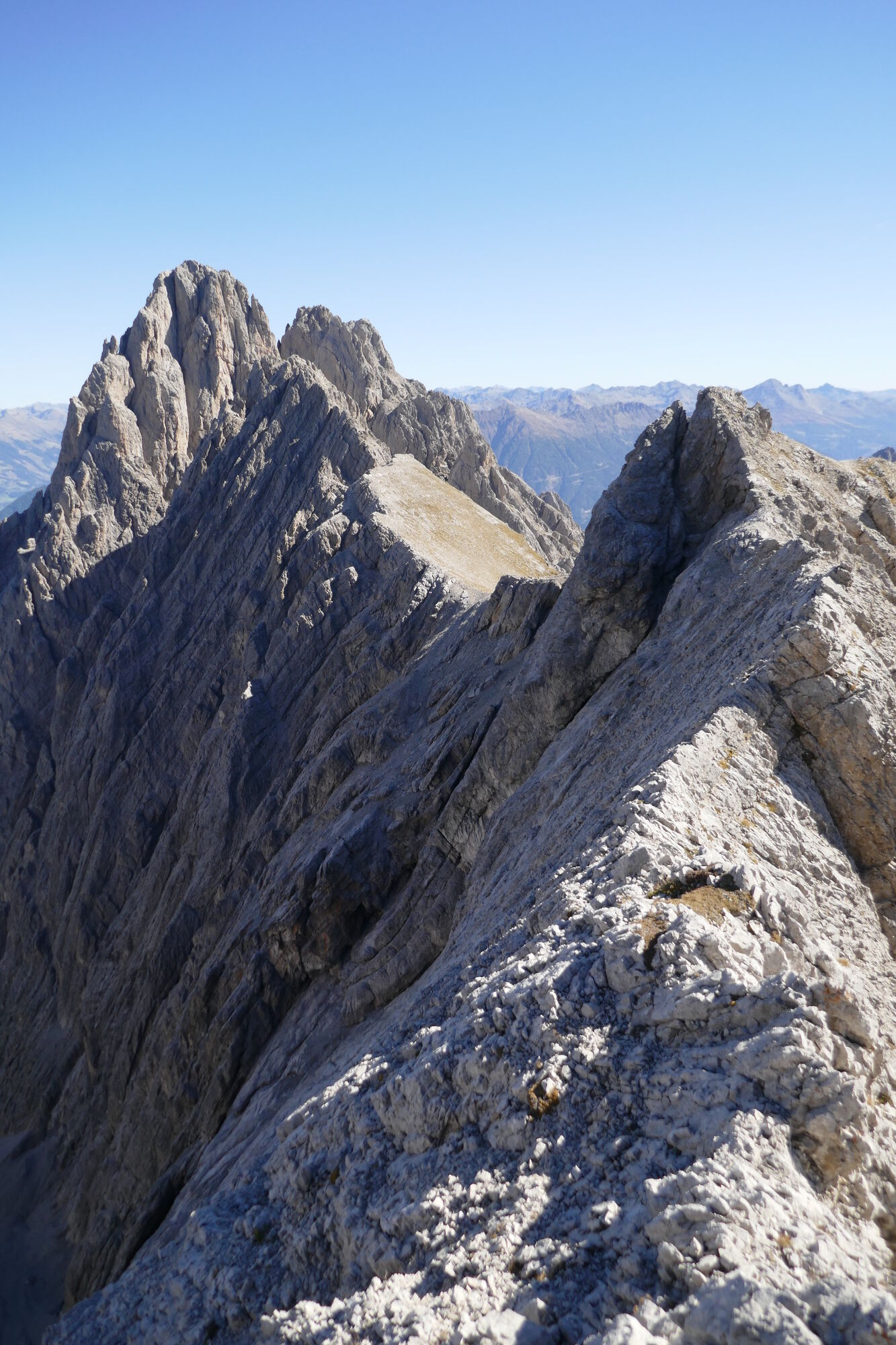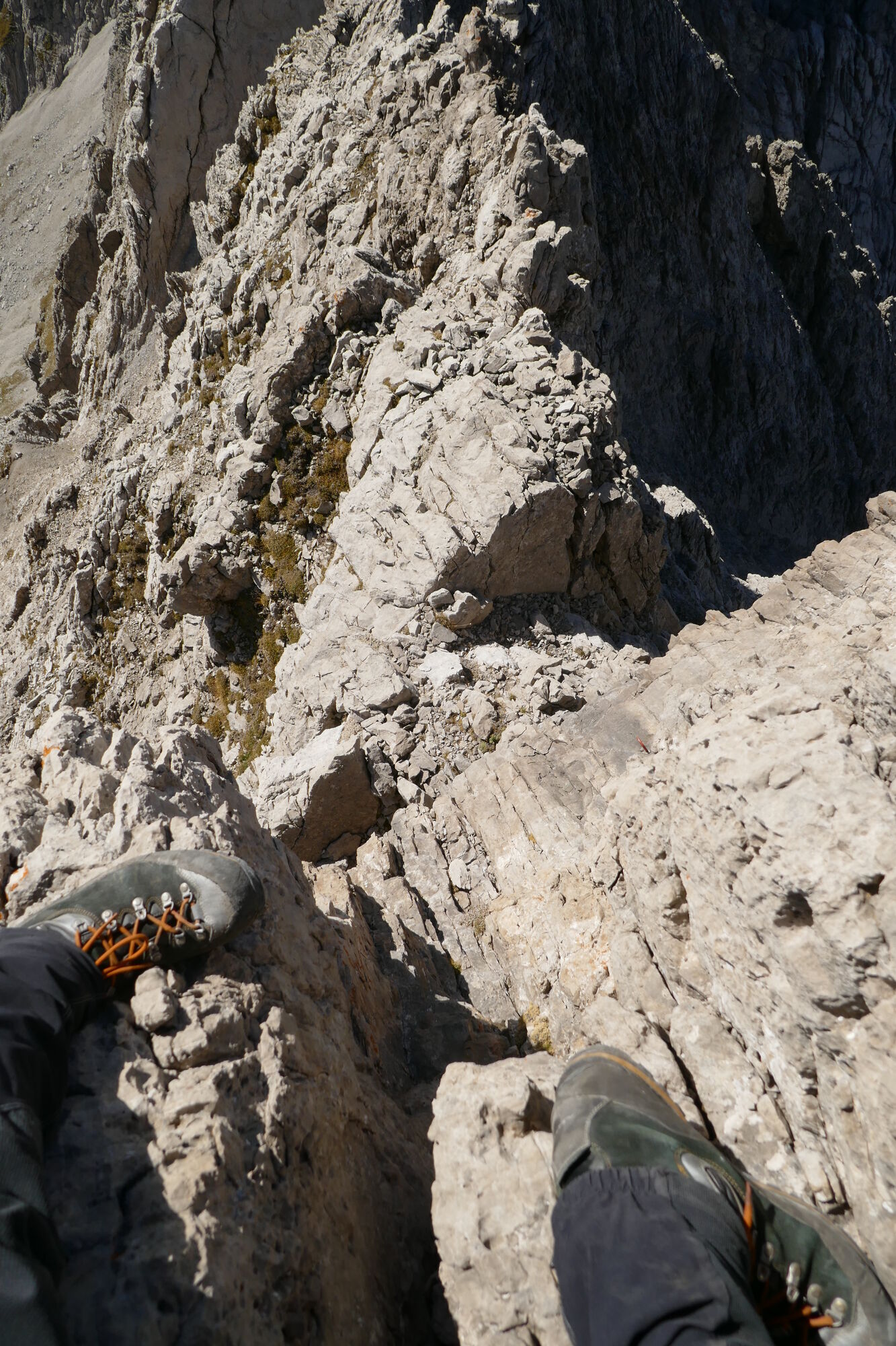 Oben angekommen geht es recht gemütlich Richtung NO-Gipfel, welchen man jedoch nicht ersteigt. Stattdessen begibt man sich in die Scharte zwischen NO-Gipfel und dem Felszacken rechts davon. Sehr steil geht es etwa 5-7 Meter abwärts um dann wieder rechts auf den NO-Grat hinaus zu queren, ein Felszacken wird rechts umgangen und danach geht es vergleichsweise einfach in das Schartenkammschartl.