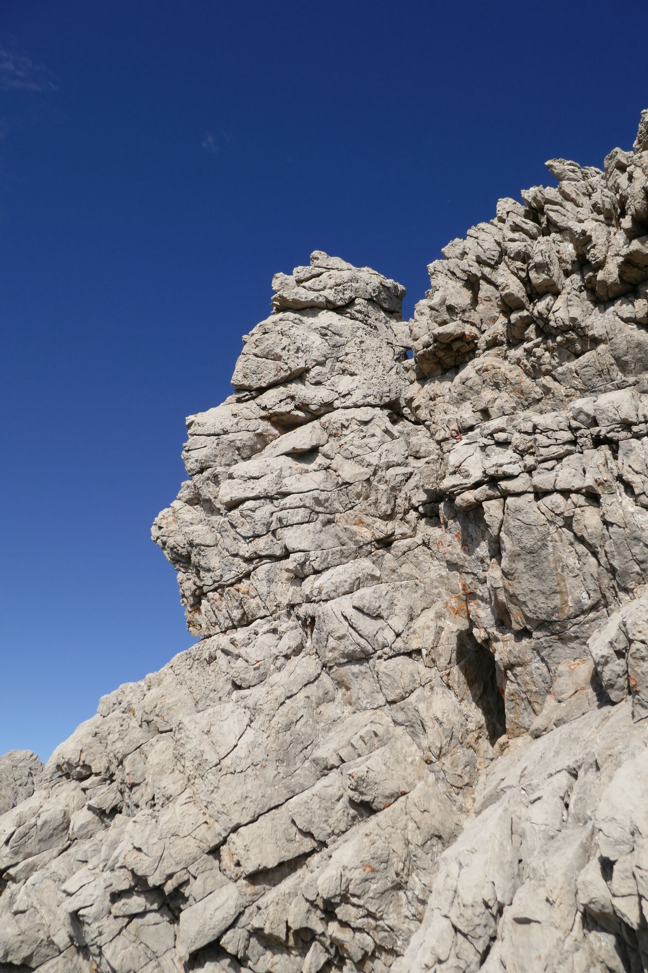 Ab jetzt wird es richtig interessant - der Eindruck schindende erste Grataufschwung wird leicht rechts in schönem festen Fels erklommen - der Fels ist äußerst selten lose. Beim nächsten Aufschwung muss man links nach außen queren - hier befindet sich auch einer der spärlich gesäten, roten, Sicherungshaken. Kurz vorm SW-Gipfel ist noch ein leicht überhängender Kamin mit etwas abdrängendem Fels zu bewältigen - auch wenn in der Führerliteratur der Grat mit UIAA II angegeben ist, würde ich diese Stelle als UIAA III bewerten.
