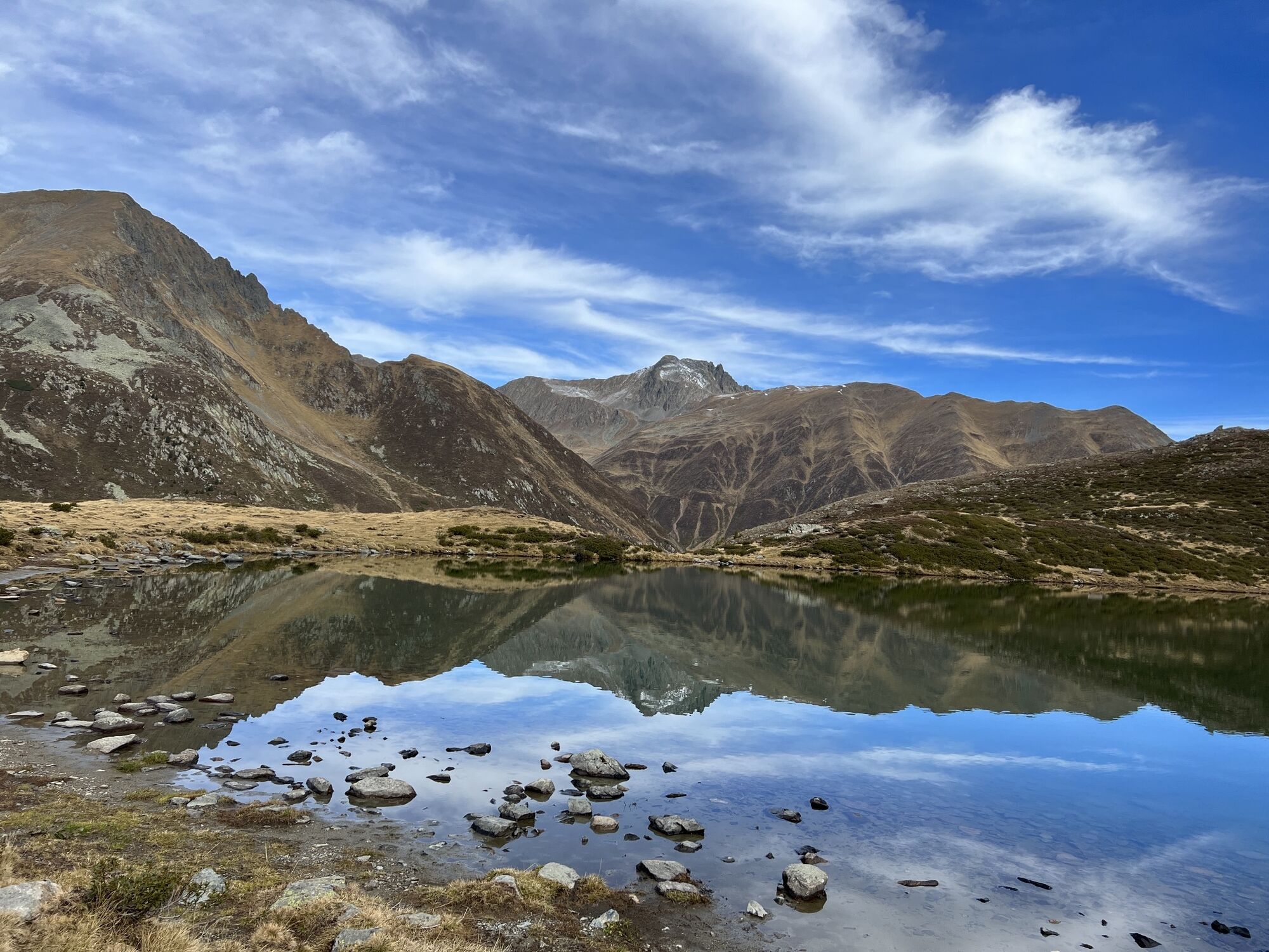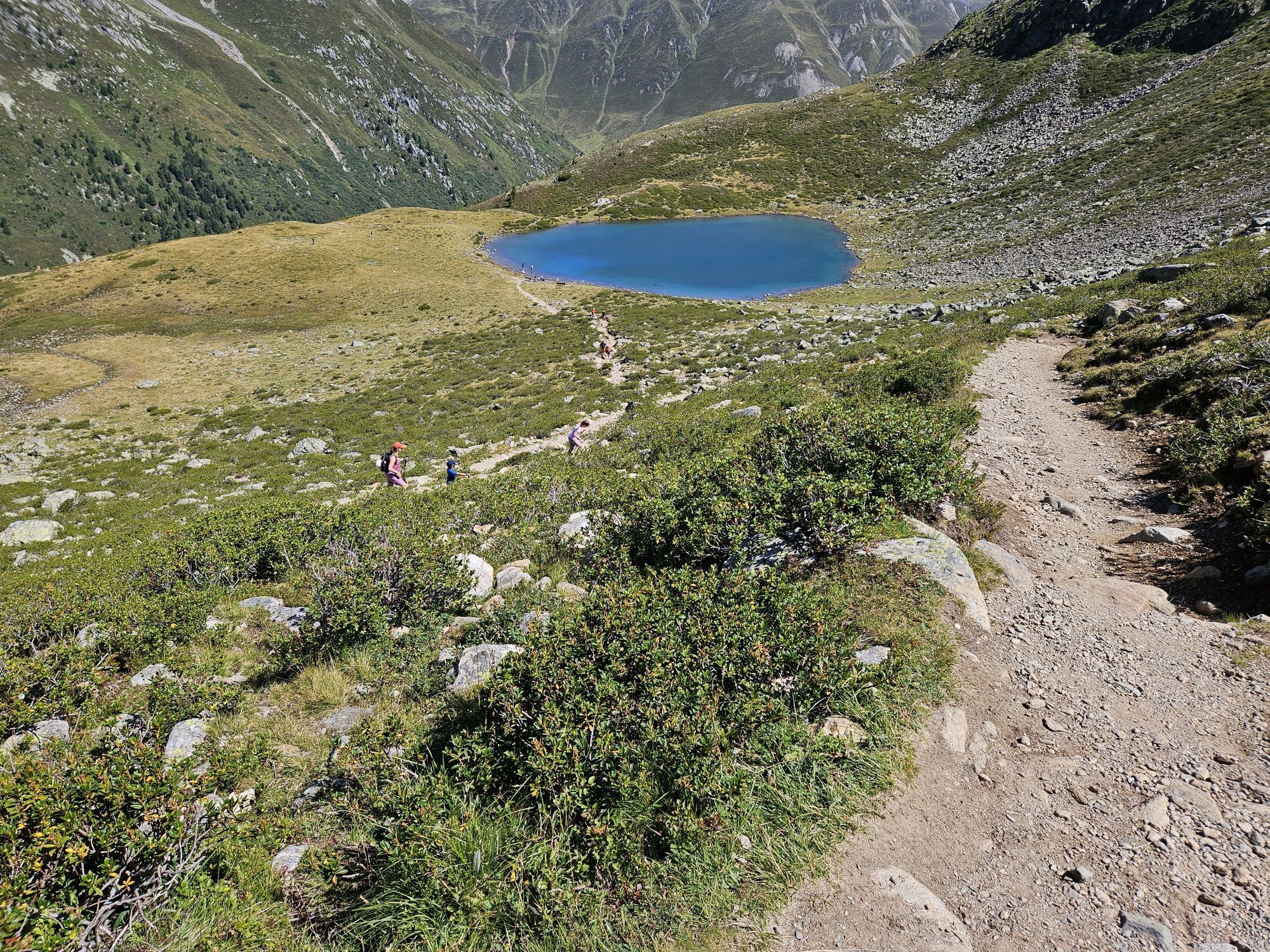 Der Weg beginnt direkt gegenüber der Tourismusinformation Kühtai, hinter dem Wiesberghaus. Zunächst verläuft er sanft ansteigend durch die alpine Landschaft und führt zum ersten Highlight der Tour, dem Hirschebensee (2.164 m), dessen klare Wasserfläche sich harmonisch in die umliegende Bergkulisse einfügt. Weiter geht es bergauf, während sich die Aussicht immer weiter öffnet. Nach einem etwas steileren Anstieg erreicht man den Mittleren Plenderlessee (2.317 m), eingebettet zwischen sanften Berghängen und schroffen Felsen.