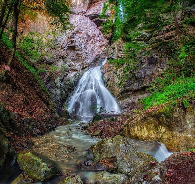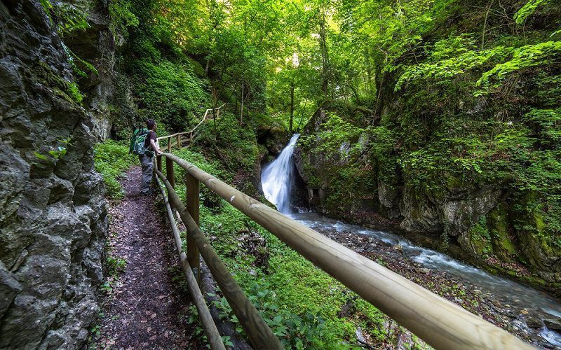 Vom Gasthof Bucherwirt aus wandert man zunächst den Schildern folgend, die schmale Bergstraße hinauf Richtung Schöllerberg. Der Weg führt an einigen Wohnhäusern, Wiesen und Feldern vorbei, bis man schließlich am Waldrand ankommt. Hier zweigt rechts der Wasserfallpfad ab und führt auf einen schmalen Wandersteig. Über ca. 60 Stufen geht es nun aufwärts zum Bucher Wasserfall, einem verborgenen landschaftlichen Kleinod. Hier beeindruckt eine artenreiche Pflanzenvielfalt sowie die einzigartig gefalteten Gesteinsformationen. Die feuchte Kühle der Bäume und das plätschernde Wasser sorgen für Momente der Erholung.