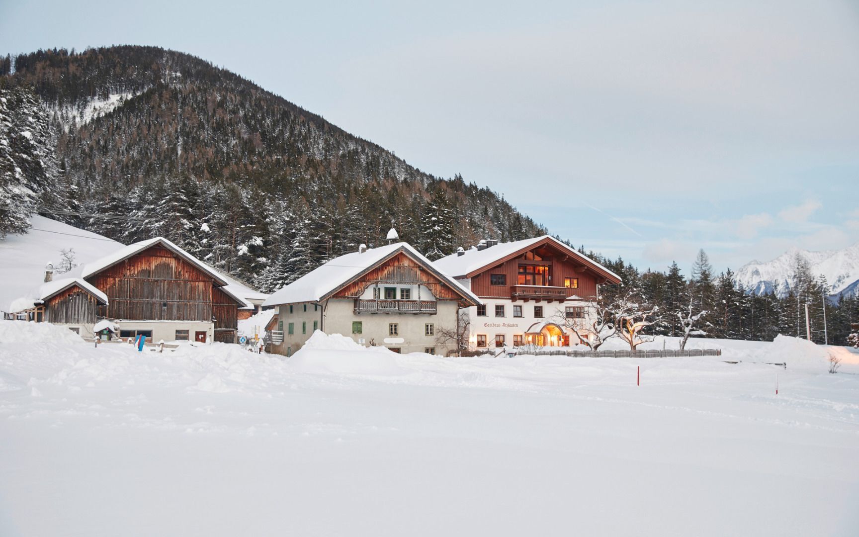Bald erreicht man einige Häuser im Ortsteil Weisland. Hier quert man den Winterwanderweg, lässt die Loipe rechts liegen und folgt dem gewalzten Weg Richtung Süden. Wer möchte, legt auf diesem Wegstück schon einen Abstecher für einen ersten Erfrischungsstopp im Kinderhotel Lärchenhof ein. Ansonsten biegt man bei der nächsten Gelegenheit nach links auf einen weiteren Winterwanderweg ab, quert den Forstweg und biegt danach links ab zurück zum Parkplatz. Hier lohnt es sich, die Wanderung auf der Sonnenterrasse des Gasthauses Arzkasten ausklingen zu lassen.