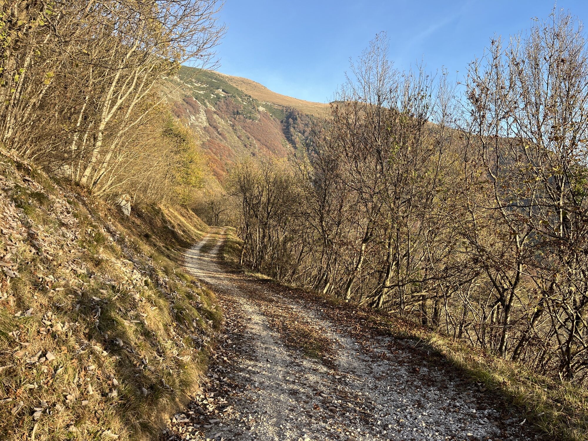 From the pass, the forest road starts to descend with low gradients. We ride past the turning point to Malga Zanga and turn into an asphalt road passing by Agriturismo Torboli to join the main road which links Arco to Passo Santa Barbara. We follow it for about 800 m and at the hairpin bend we take the dirt road leading to the church of San Francesco. We keep downhill, now on markedly steeper terrain, along the Monte Corno forest road and reach Malga Fiavei, a visibly abandoned building.
