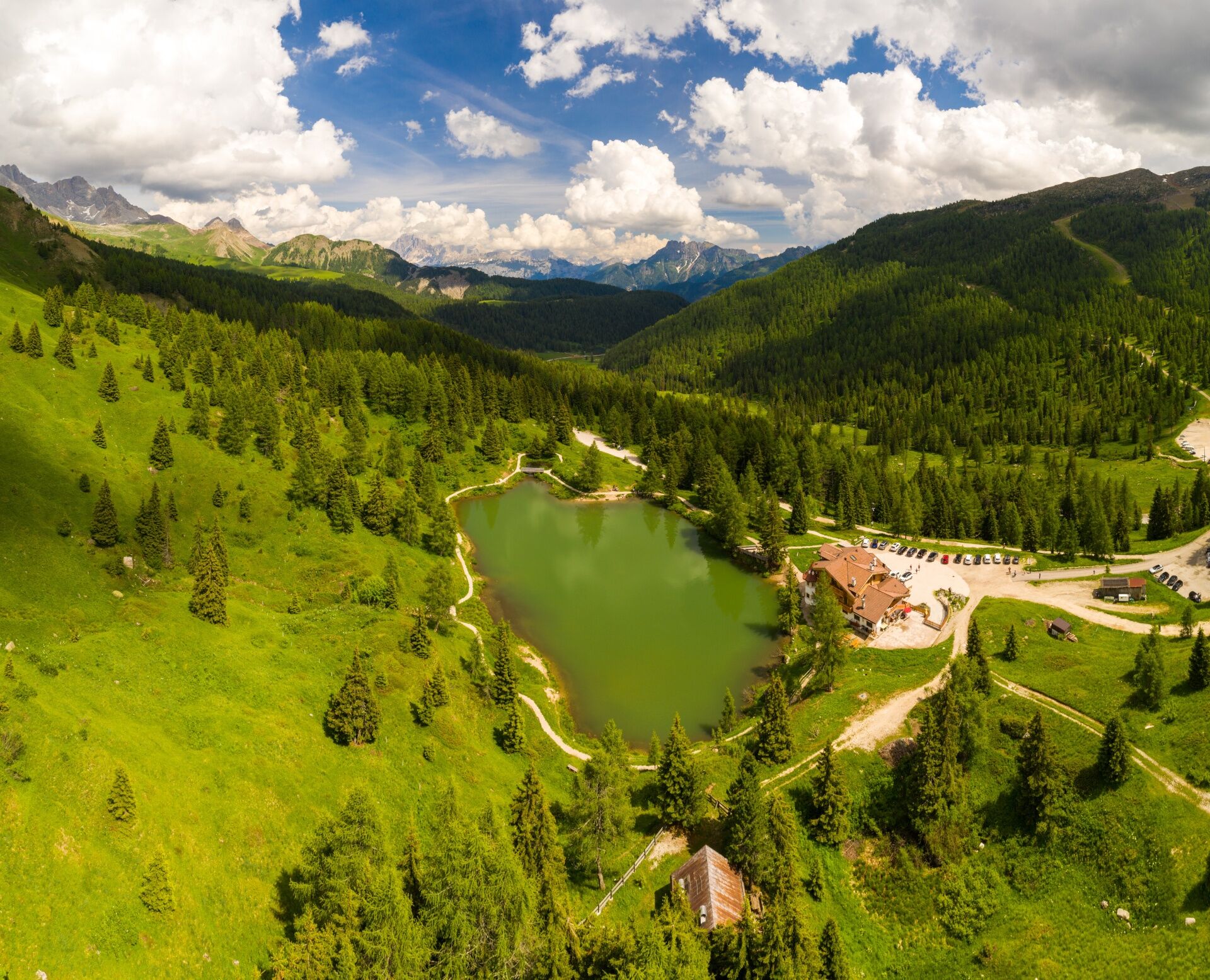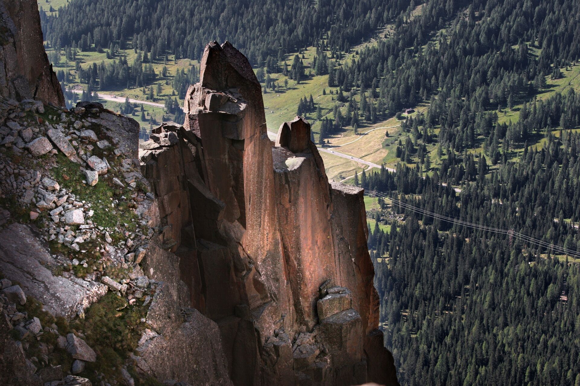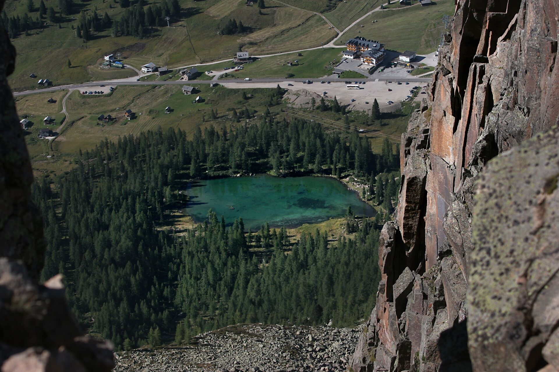From Passo San Pellegrino, take the cable car to reach the Col Margherita. From the top station of the lift, descend along the dirt road that retraces the ski slope (trail no. 695). Then reach the Forcella di Pradazzo, where trail no. 658 from Passo Valles also converges. Now follow trail no. 695 which descends, through pastures and rocks, towards the artificial Cavia lake. Pass below the basin, moving to the opposite shore. Climb back up the rocky slope, with some ups and downs, arriving at Col Caviette, from where you rejoin trail no. 658. Follow it and shortly reach the Pale del Cargol balcony. Bypass the porphyric promontory towards the south, cross a rocky basin and finally the ski slope descending from Col Margherita. The trail now heads towards the pass. Through small clearings, dense rhododendron bushes and a sparse forest of Swiss stone pines and larches, you reach the cable car lower station.